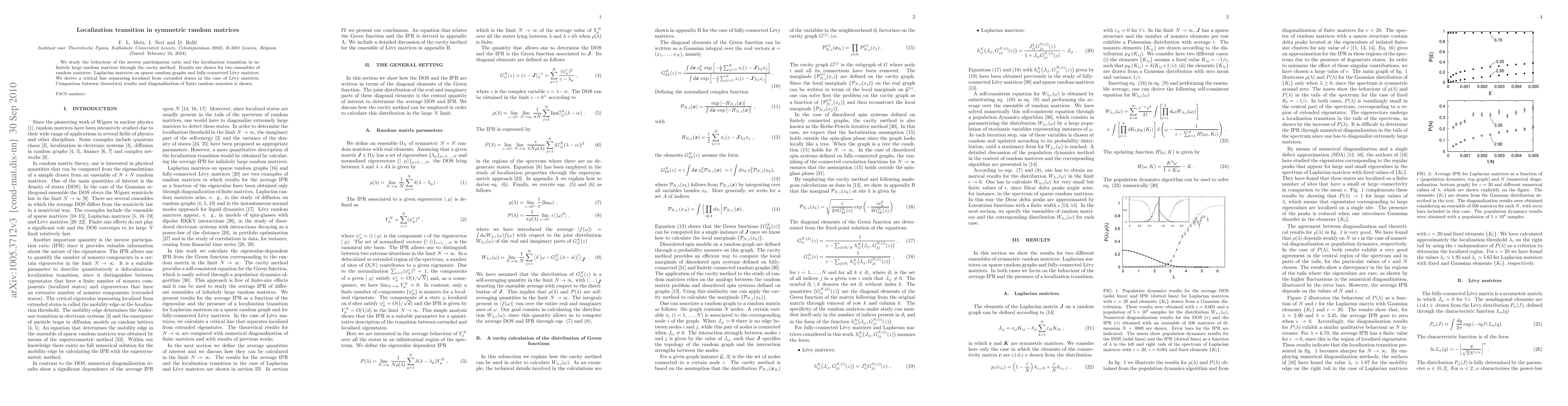 The paper investigates the localization transition in symmetric random matrices using the cavity method, analyzing Laplacian matrices on sparse graphs and L\'evy matrices, and identifies a critical line for L\'evy matrices distinguishing localized from extended states, supported by comparisons with finite matrix diagonalizations.