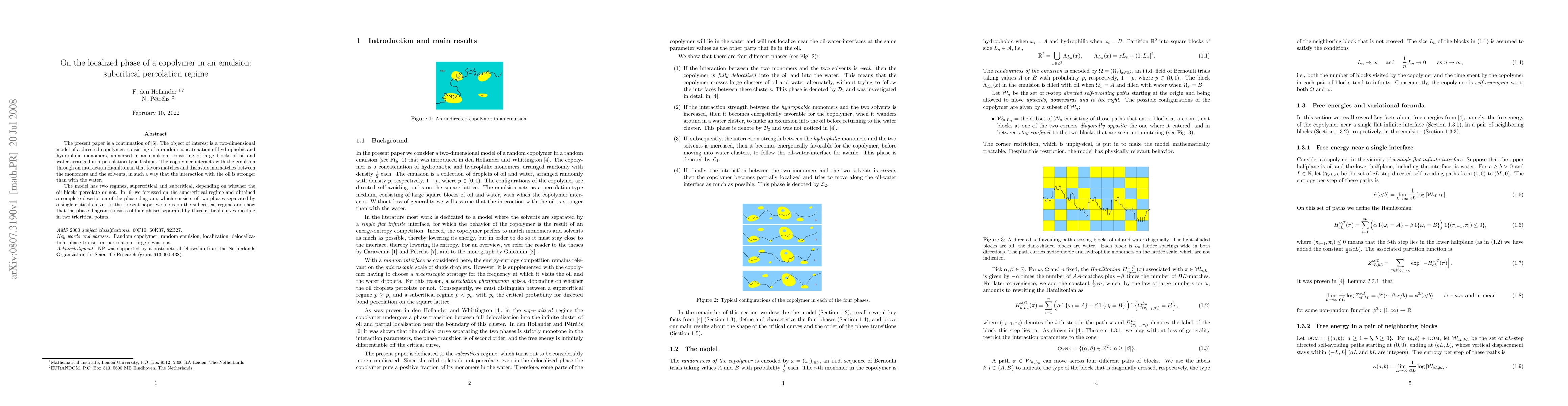 Researchers study a 2D model of a directed copolymer in an emulsion, finding four phases with three critical curves in the subcritical regime, whereas two phases existed in the supercritical regime.