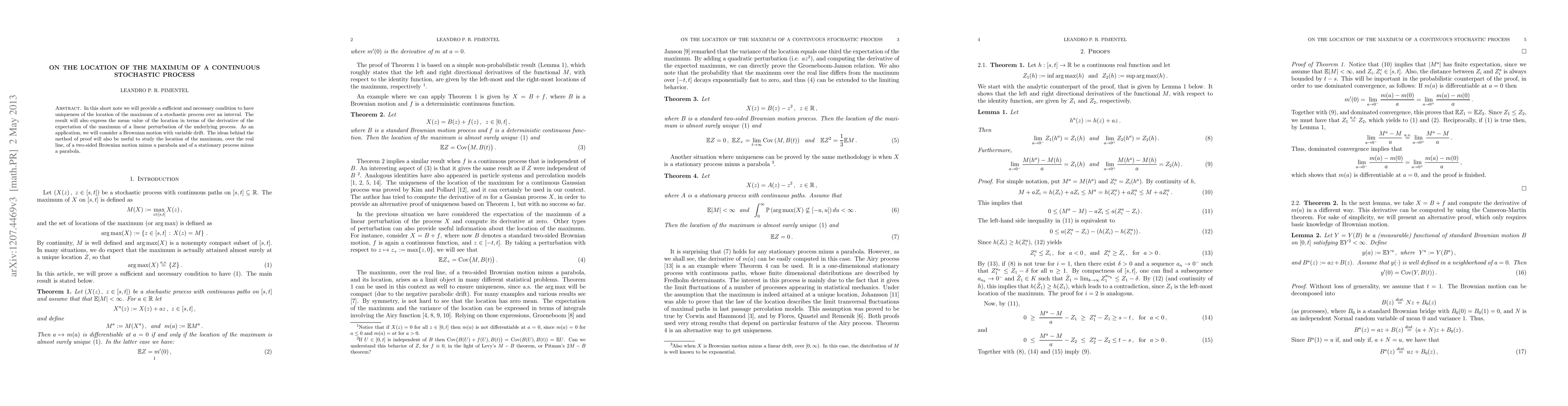 In this short note we will provide a sufficient and necessary condition to have uniqueness of the location of the maximum of a stochastic process over an interval. The result will also express the mean value of the location in terms of the derivative of the expectation of the maximum of a linear perturbation of the underlying process. As an application, we will consider a Brownian motion with variable drift. The ideas behind the method of proof will also be useful to study the location of the maximum, over the real line, of a two-sided Brownian motion minus a parabola and of a stationary process minus a parabola.