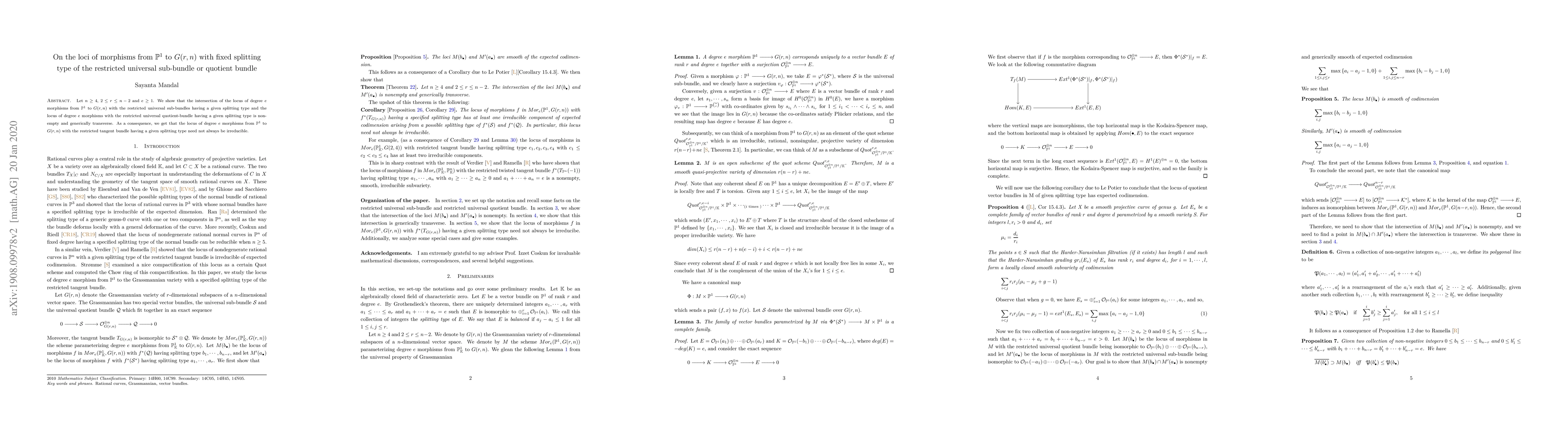 The study investigates morphisms from $ extbf{P}^1$ to $G(r,n)$ with specific splitting types, finding that their loci are non-empty and generically transverse, challenging the notion of irreducibility for certain tangent bundles.
