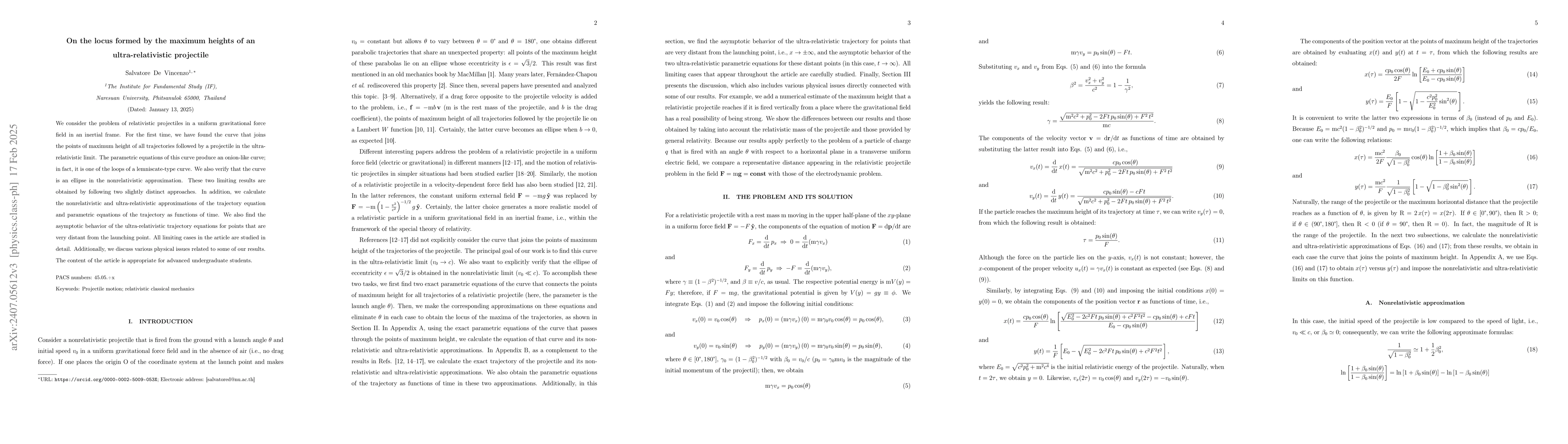 We consider the problem of relativistic projectiles in a uniform gravitational force field in an inertial frame. For the first time, we have found the curve that joins the points of maximum height of all trajectories followed by a projectile in the ultra-relativistic limit. The parametric equations of this curve produce an onion-like curve; in fact, it is one of the loops of a lemniscate-type curve. We also verify that the curve is an ellipse in the nonrelativistic approximation. These two limiting results are obtained by following two slightly distinct approaches. In addition, we calculate the nonrelativistic and ultra-relativistic approximations of the trajectory equation and parametric equations of the trajectory as functions of time. We also find the asymptotic behavior of the ultra-relativistic trajectory equations for points that are very distant from the launching point. All limiting cases in the article are studied in detail. Additionally, we discuss various physical issues related to some of our results. The content of the article is appropriate for advanced undergraduate students.