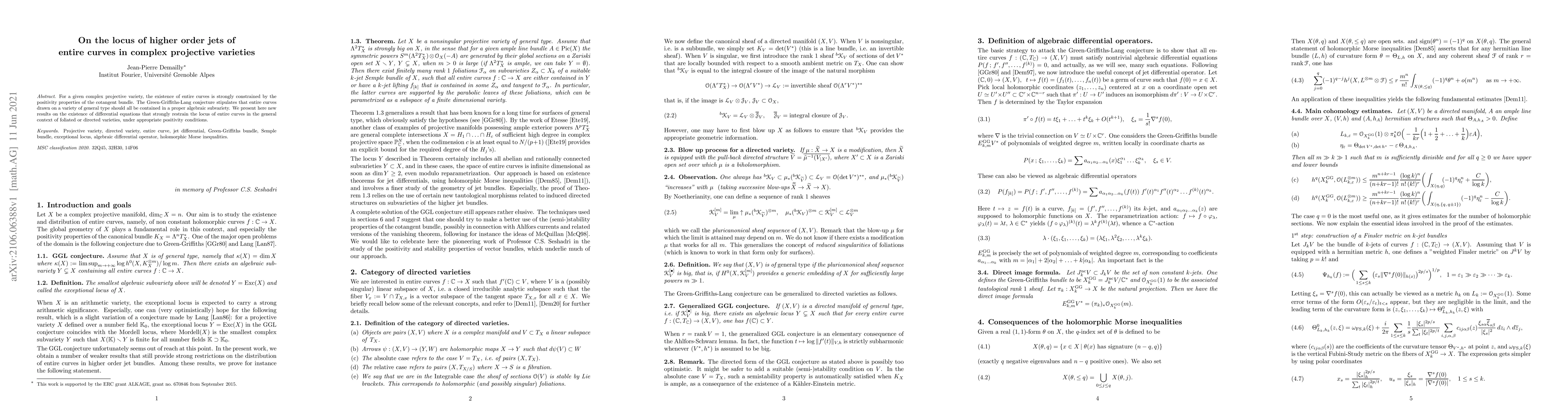 For a given complex projective variety, the existence of entire curves is strongly constrained by the positivity properties of the cotangent bundle. The Green-Griffiths-Lang conjecture stipulates that entire curves drawn on a variety of general type should all be contained in a proper algebraic subvariety. We present here new results on the existence of differential equations that strongly restrain the locus of entire curves in the general context of foliated or directed varieties, under appropriate positivity conditions.