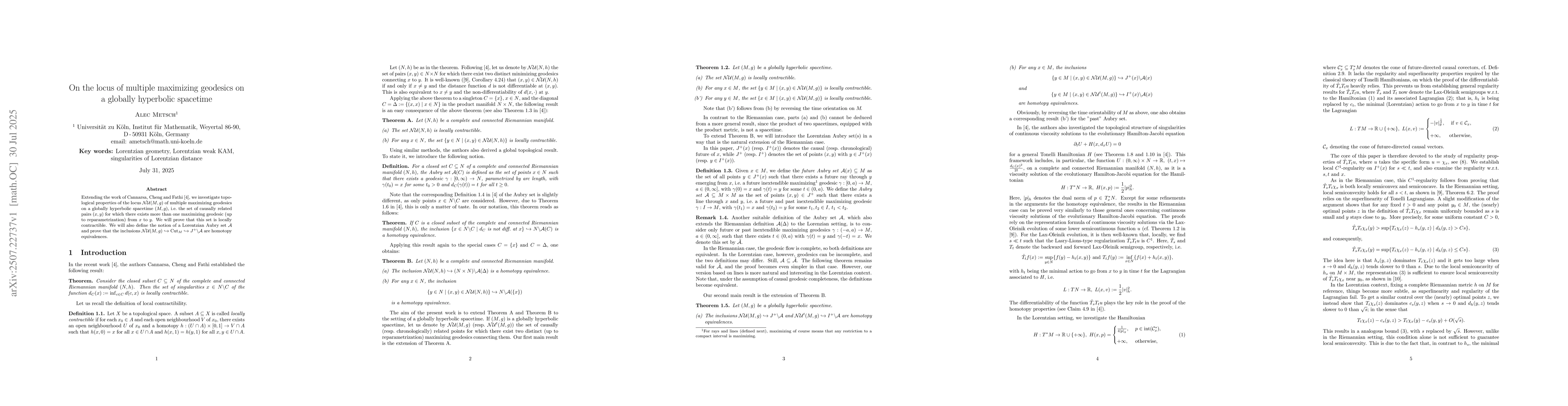 Extending the recent work of Cannarsa, Cheng and Fathi, we investigate topological properties of the locus ${\cal NU}(M,g)$ of multiple maximizing geodesics on a globally hyperbolic spacetime $(M,g)$, i.e.\ the set of causally related pairs $(x,y)$ for which there exists more than one maximizing geodesic (up to reparametrization) from $x$ to $y$. We will prove that this set is locally contractible. We will also define the notion of a Lorentzian Aubry set ${\cal A}$ and prove that the inclusions ${\cal NU}(M,g)\hookrightarrow \operatorname{Cut}_M\hookrightarrow J^+\backslash {\cal A}$ are homotopy equivalences.