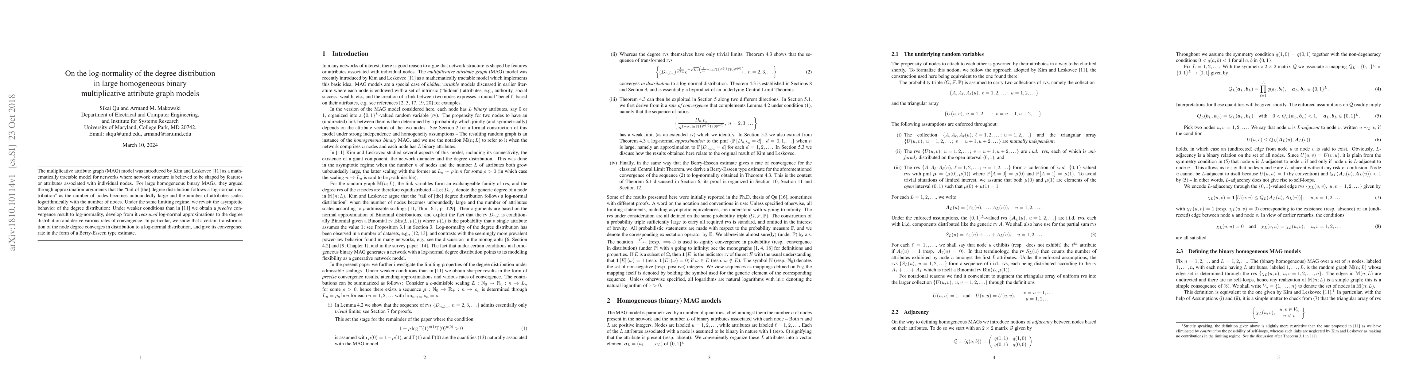 This paper revisits the degree distribution in large homogeneous binary multiplicative attribute graph models, confirming that under specific scaling conditions, the degree distribution converges to a log-normal distribution with a precise convergence rate, providing a Berry-Esseen type estimate for the rate of convergence.