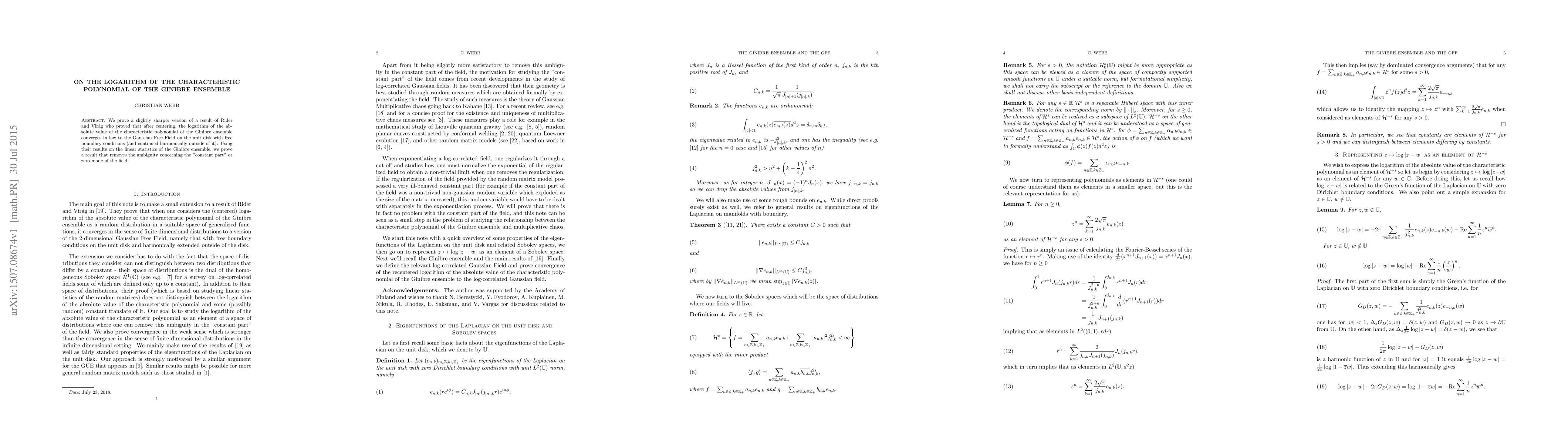 Summary: This paper refines a result by Rider and Virág, showing that the logarithm of the absolute value of the characteristic polynomial of the Ginibre ensemble converges to the Gaussian Free Field, and clarifies the "constant part" or zero mode of the field, removing ambiguity.