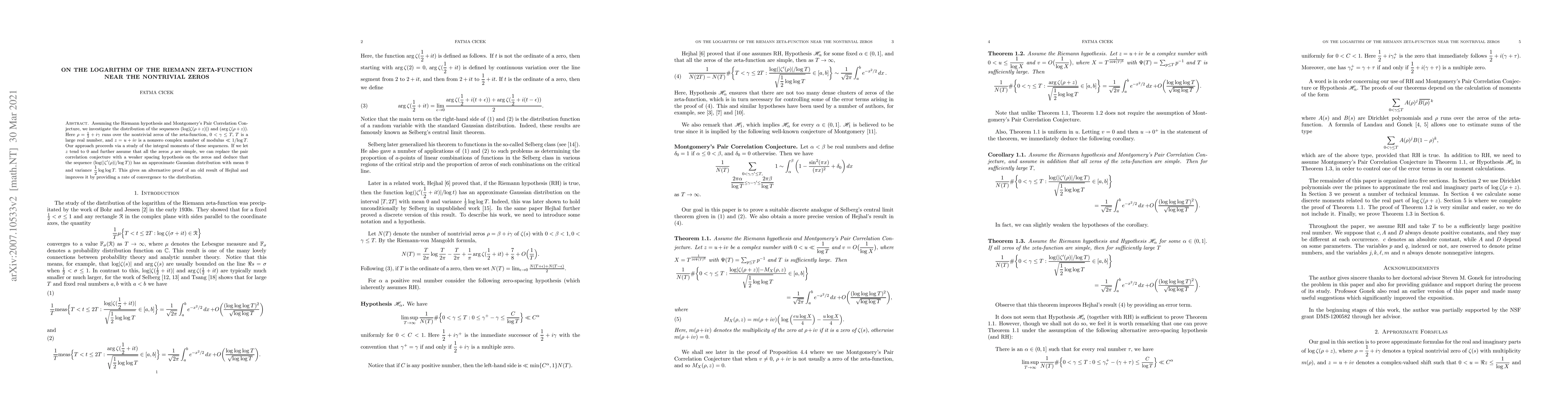 This paper explores the distribution of the logarithm and argument of the Riemann zeta-function near its nontrivial zeros under the Riemann hypothesis and the Montgomery Pair Correlation Conjecture. It provides an alternative proof and improved rate of convergence for the Gaussian distribution of the sequence $(\log (|\zeta^\prime(\rho)|/\log T))$ with mean $0$ and variance $\frac12\log\log T$.