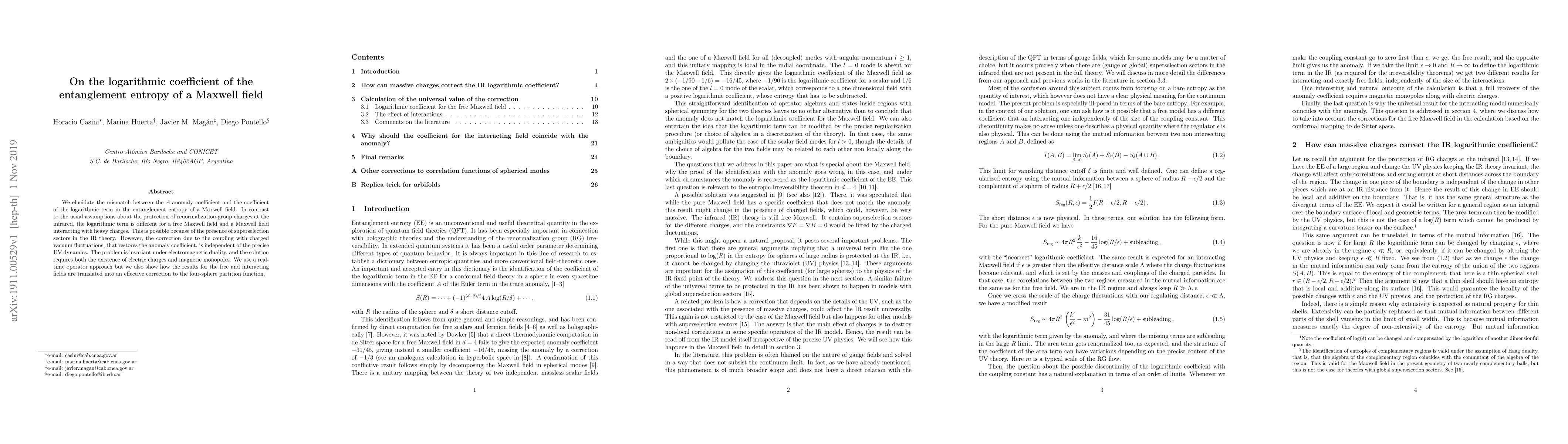 We elucidate the mismatch between the $A$-anomaly coefficient and the coefficient of the logarithmic term in the entanglement entropy of a Maxwell field. In contrast to the usual assumptions about the protection of renormalization group charges at the infrared, the logarithmic term is different for a free Maxwell field and a Maxwell field interacting with heavy charges. This is possible because of the presence of superselection sectors in the IR theory. However, the correction due to the coupling with charged vacuum fluctuations, that restores the anomaly coefficient, is independent of the precise UV dynamics. The problem is invariant under electromagnetic duality, and the solution requires both the existence of electric charges and magnetic monopoles. We use a real-time operator approach but we also show how the results for the free and interacting fields are translated into an effective correction to the four-sphere partition function.