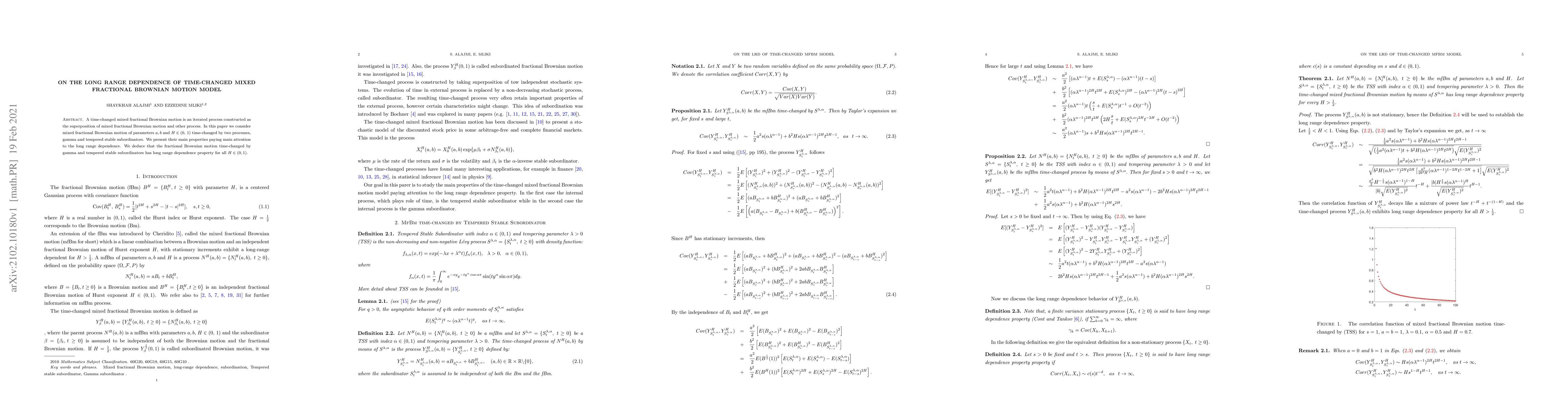 A time-changed mixed fractional Brownian motion is an iterated process constructed as the superposition of mixed fractional Brownian motion and other process. In this paper we consider mixed fractional Brownian motion of parameters a, b and H\in(0, 1) time-changed by two processes, gamma and tempered stable subordinators. We present their main properties paying main attention to the long range dependence. We deduce that the fractional Brownian motion time-changed by gamma and tempered stable subordinators has long range dependence property for all H\in(0, 1).