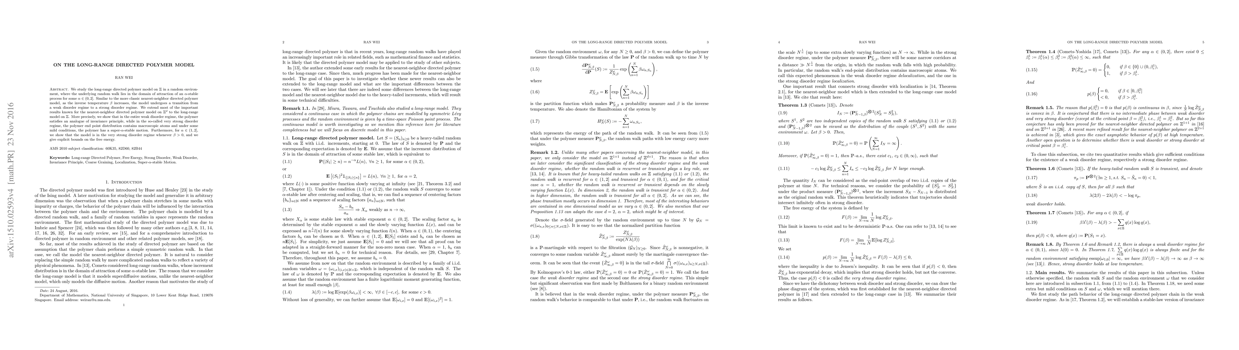 We study the long-range directed polymer model on $\mathbbm{Z}$ in a random environment, where the underlying random walk lies in the domain of attraction of an $\alpha$-stable process for some $\alpha\in(0,2]$. Similar to the more classic nearest-neighbor directed polymer model, as the inverse temperature $\beta$ increases, the model undergoes a transition from a weak disorder regime to a strong disorder regime. We extend most of the important results known for the nearest-neighbor directed polymer model on $\mathbbm{Z}^d$ to the long-range model on $\mathbbm{Z}$. More precisely, we show that in the entire weak disorder regime, the polymer satisfies an analogue of invariance principle, while in the so-called very strong disorder regime, the polymer end point distribution contains macroscopic atoms and under some mild conditions, the polymer has a super-$\alpha$-stable motion. Furthermore, for $\alpha \in (1,2]$, we show that the model is in the very strong disorder regime whenever $\beta>0$, and we give explicit bounds on the free energy.