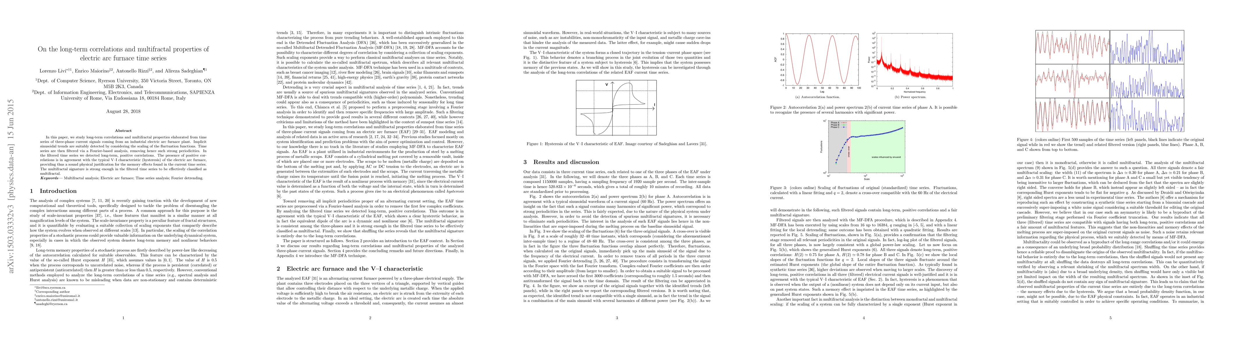 In this paper, we study long-term correlations and multifractal properties elaborated from time series of three-phase current signals coming from an industrial electric arc furnace plant. Implicit sinusoidal trends are suitably detected by considering the scaling of the fluctuation functions. Time series are then filtered via a Fourier-based analysis, removing hence such strong periodicities. In the filtered time series we detected long-term, positive correlations. The presence of positive correlations is in agreement with the typical V--I characteristic (hysteresis) of the electric arc furnace, providing thus a sound physical justification for the memory effects found in the current time series. The multifractal signature is strong enough in the filtered time series to be effectively classified as multifractal.