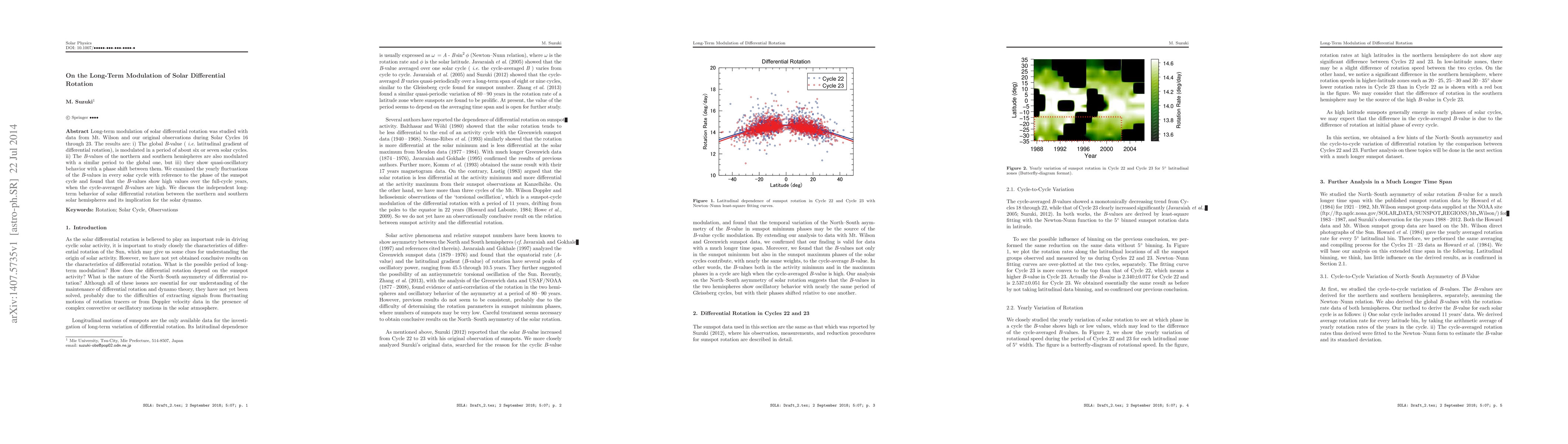 This paper investigates the long-term modulation of solar differential rotation over Solar Cycles 16 through 23, revealing a six to seven-cycle period of modulation in the global B-value and quasi-oscillatory phase-shifted behavior in the northern and southern hemispheres. The study highlights the independent long-term behavior of the solar differential rotation between the two hemispheres and its implications for the solar dynamo.