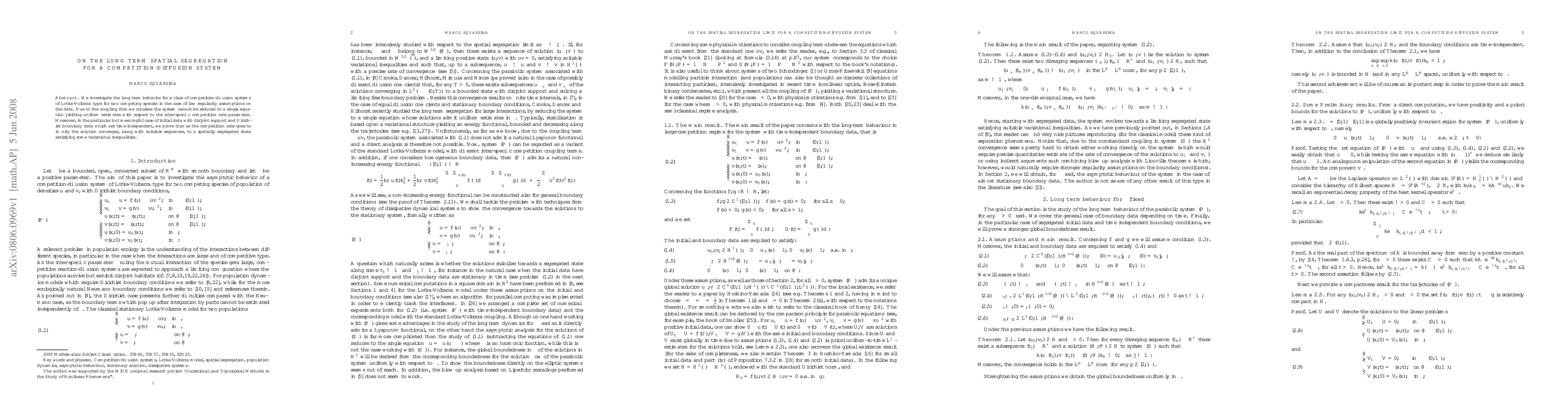 We investigate the long term behavior for a class of competition-diffusion systems of Lotka-Volterra type for two competing species in the case of low regularity assumptions on the data. Due to the coupling that we consider the system cannot be reduced to a single equation yielding uniform estimates with respect to the inter-specific competition rate parameter. Moreover, in the particular but meaningful case of initial data with disjoint support and Dirichlet boundary data which are time-independent, we prove that as the competition rate goes to infinity the solution converges, along with suitable sequences, to a spatially segregated state satisfying some variational inequalities.