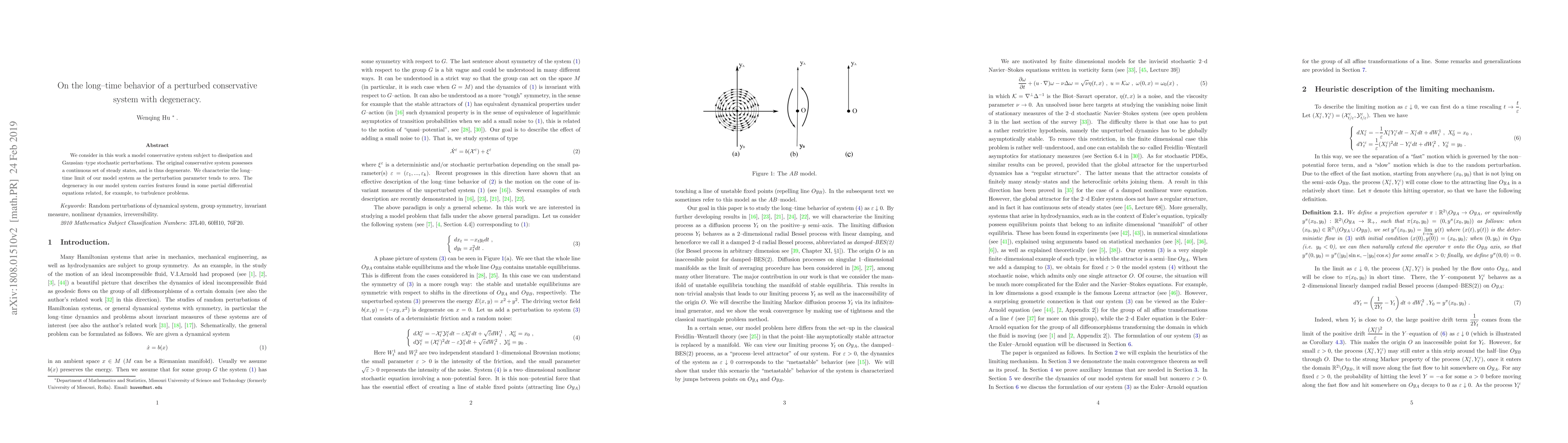 A study on a model conservative system with degeneracy under Gaussian-type stochastic perturbations reveals the long-time behavior as the perturbation parameter approaches zero. The system's degeneracy leads to features similar to those found in turbulence problems, shedding light on complex dynamics.