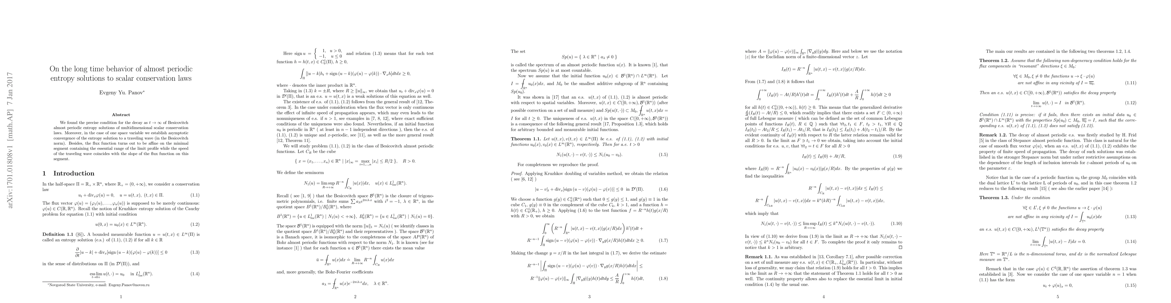 We found the precise condition for the decay as $t\to\infty$ of Besicovitch almost periodic entropy solutions of multidimensional scalar conservation laws. Moreover, in the case of one space variable we establish asymptotic convergence of the entropy solution to a traveling wave (in the Besicovitch norm). Besides, the flux function turns out to be affine on the minimal segment containing the essential range of the limit profile while the speed of the traveling wave coincides with the slope of the flux function on this segment.