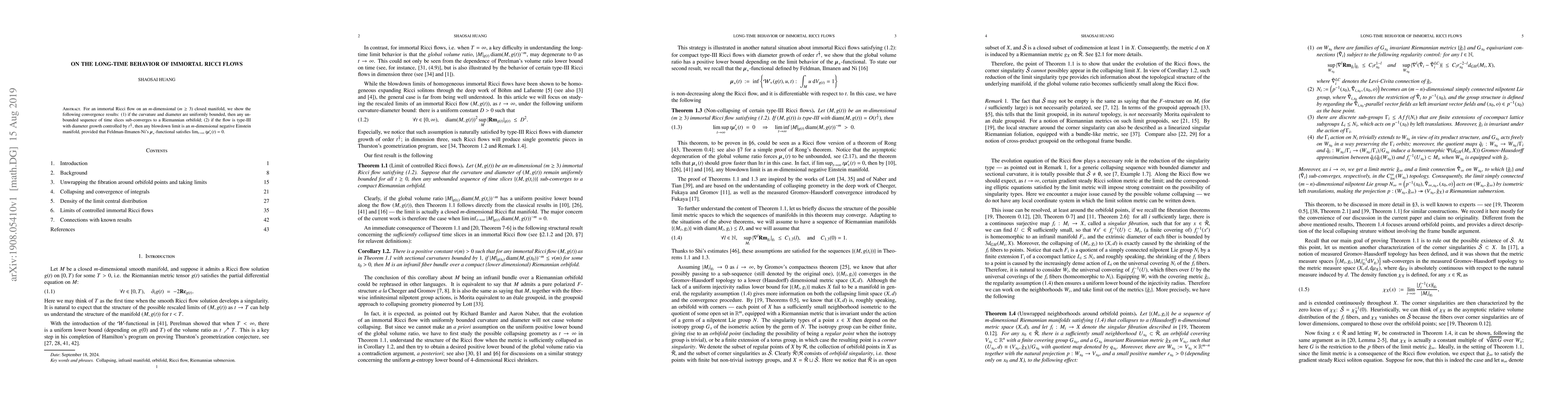 This paper investigates the long-term behavior of immortal Ricci flows on closed manifolds, proving that bounded curvature and diameter lead to convergence to Riemannian orbifolds, while type-III flows with controlled diameter growth converge to negative Einstein manifolds under specific conditions on the $\boldsymbol{\mu}_+$-functional.