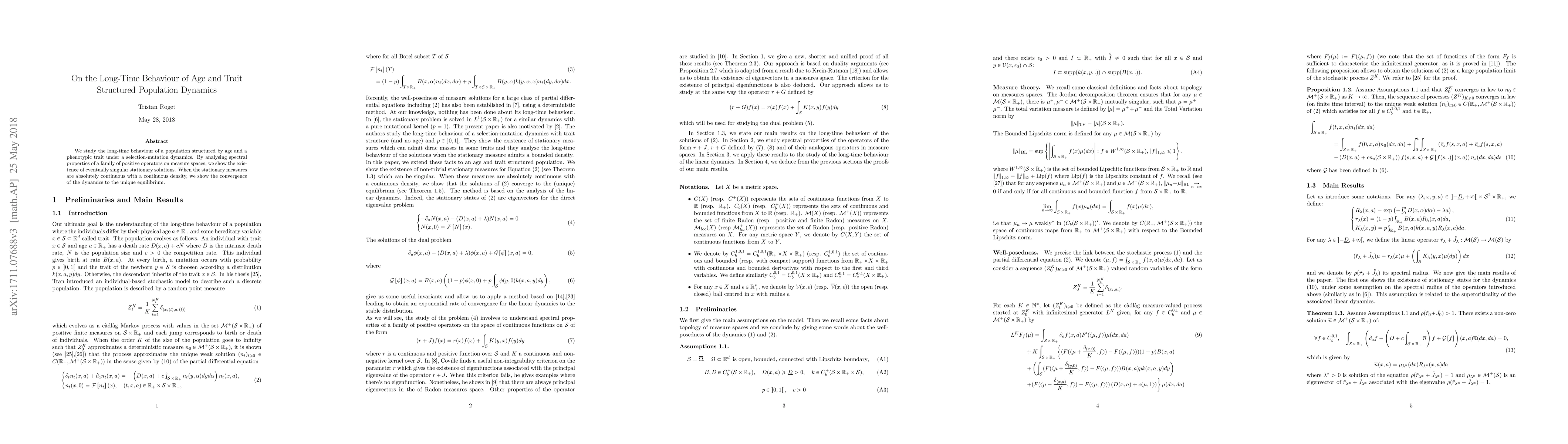 We study the long-time behaviour of a population structured by age and a phenotypic trait under a selection-mutation dynamics. By analysing spectral properties of a family of positive operators on measure spaces, we show the existence of eventually singular stationary solutions. When the stationary measures are absolutely continuous with a continuous density, we show the convergence of the dynamics to the unique equilibrium.