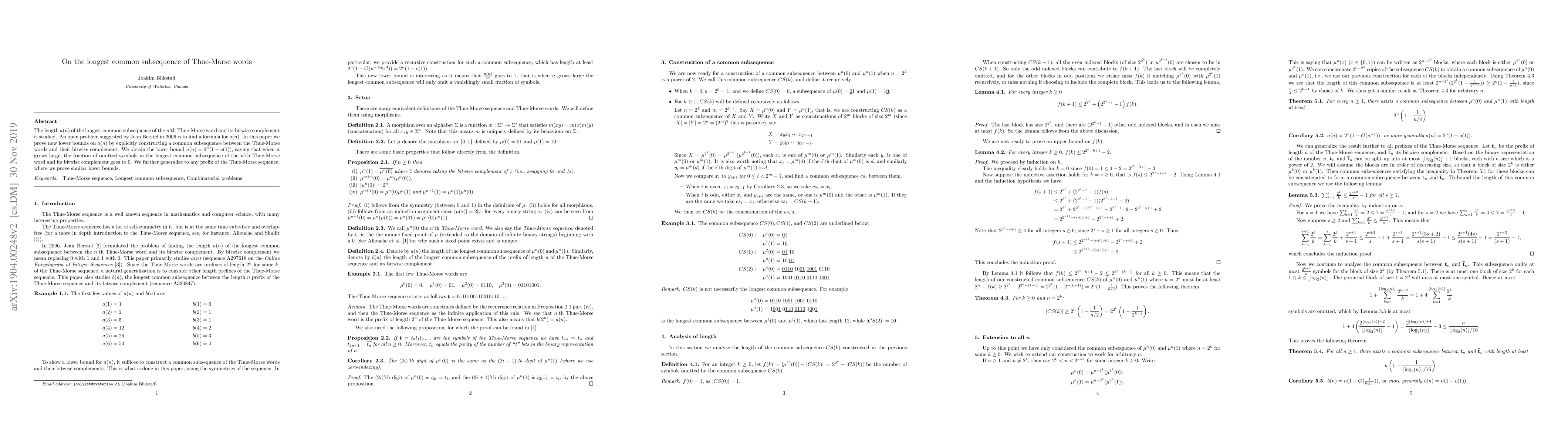The length $a(n)$ of the longest common subsequence of the $n$'th Thue-Morse word and its bitwise complement is studied. An open problem suggested by Jean Berstel in 2006 is to find a formula for $a(n)$. In this paper we prove new lower bounds on $a(n)$ by explicitly constructing a common subsequence between the Thue-Morse words and their bitwise complement. We obtain the lower bound $a(n) = 2^{n}(1-o(1))$, saying that when $n$ grows large, the fraction of omitted symbols in the longest common subsequence of the $n$'th Thue-Morse word and its bitwise complement goes to $0$. We further generalize to any prefix of the Thue-Morse sequence, where we prove similar lower bounds.