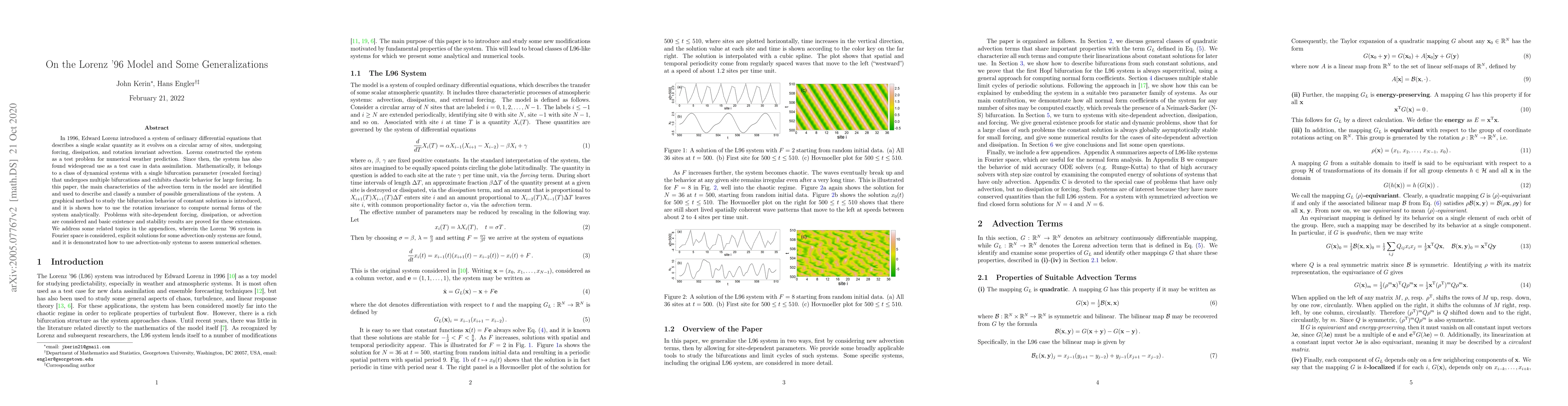 The paper generalizes Edward Lorenz's 1996 model by identifying its advection term characteristics and introducing a graphical method to study bifurcation behavior. It also explores various extensions, including site-dependent forcing, dissipation, and advection, with focus on existence and stability results.