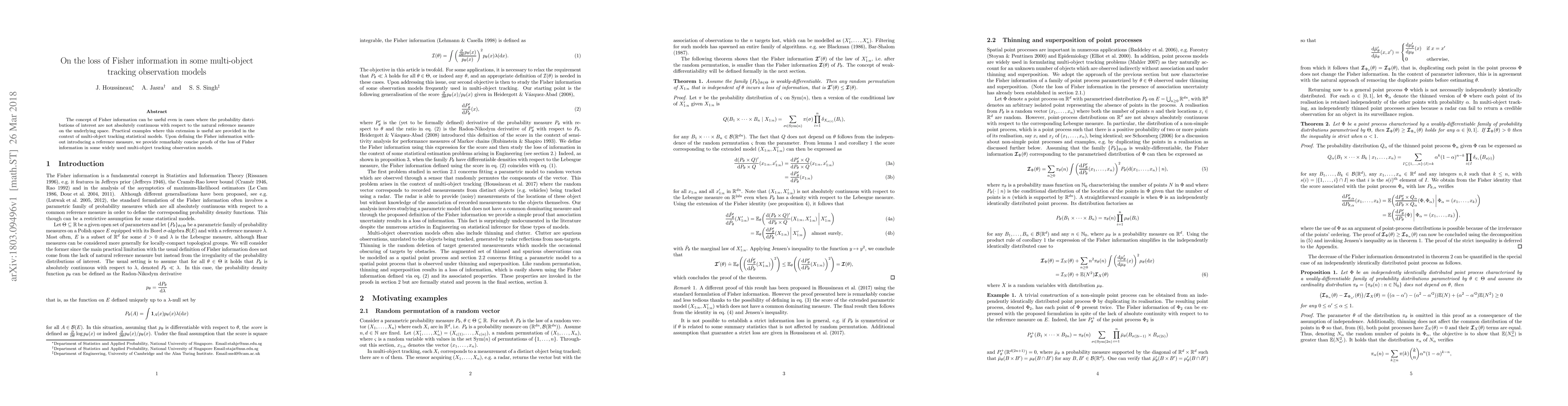 The concept of Fisher information can be useful even in cases where the probability distributions of interest are not absolutely continuous with respect to the natural reference measure on the underlying space. Practical examples where this extension is useful are provided in the context of multi-object tracking statistical models. Upon defining the Fisher information without introducing a reference measure, we provide remarkably concise proofs of the loss of Fisher information in some widely used multi-object tracking observation models.