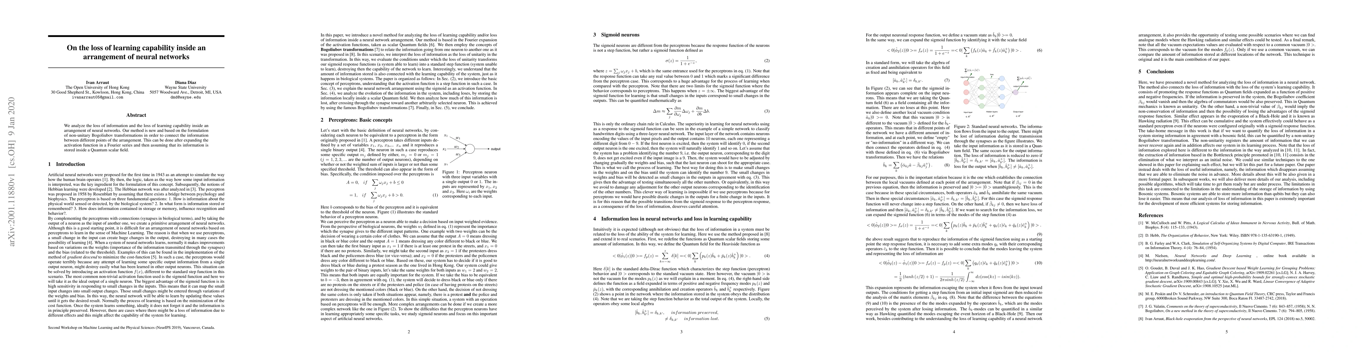 We analyze the loss of information and the loss of learning capability inside an arrangement of neural networks. Our method is new and based on the formulation of non-unitary Bogoliubov transformations in order to connect the information between different points of the arrangement. This can be done after expanding the activation function in a Fourier series and then assuming that its information is stored inside a Quantum scalar field.