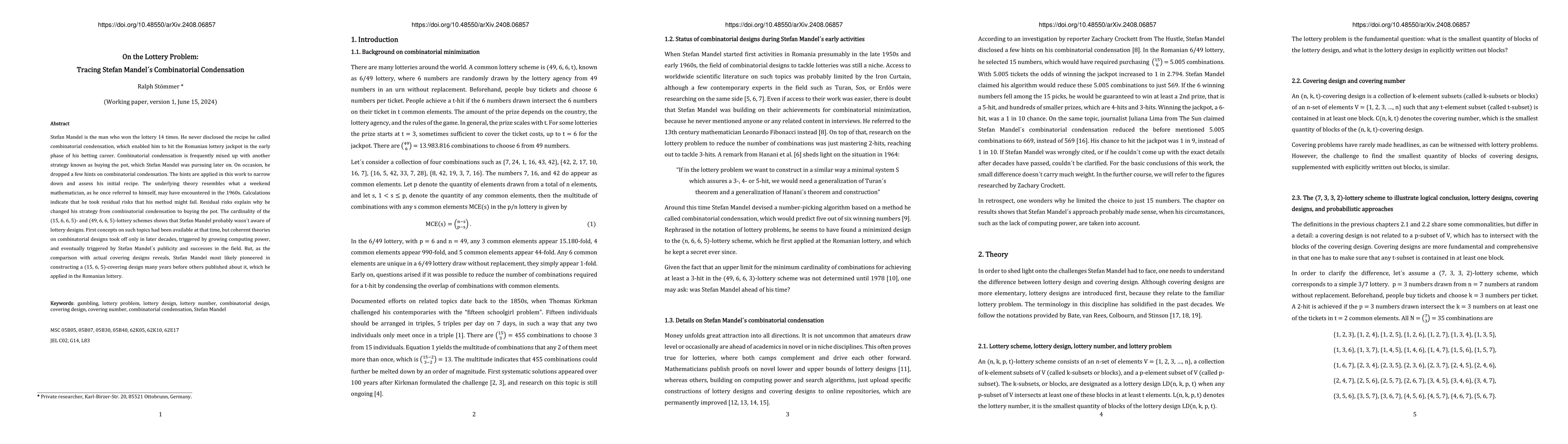 Stefan Mandel is the man who won the lottery 14 times. He never disclosed the recipe he called combinatorial condensation, which enabled him to hit the Romanian lottery jackpot in the early phase of his betting career. Combinatorial condensation is frequently mixed up with another strategy known as buying the pot, which Stefan Mandel was pursuing later on. On occasion, he dropped a few hints on combinatorial condensation. The hints are applied in this work to narrow down and assess his initial recipe. The underlying theory resembles what a weekend mathematician, as he once referred to himself, may have encountered in the 1960s. Calculations indicate that he took residual risks that his method might fail. Residual risks explain why he changed his strategy from combinatorial condensation to buying the pot. The cardinality of the (15, 6, 6, 5)- and (49, 6, 6, 5)-lottery schemes shows that Stefan Mandel probably wasn't aware of lottery designs. First concepts on such topics had been available at that time, but coherent theories on combinatorial designs took off only in later decades, triggered by growing computing power, and eventually triggered by Stefan Mandel's publicity and successes in the field. But, as the comparison with actual covering designs reveals, Stefan Mandel most likely pioneered in constructing a (15, 6, 5)-covering design many years before others published about it, which he applied in the Romanian lottery.