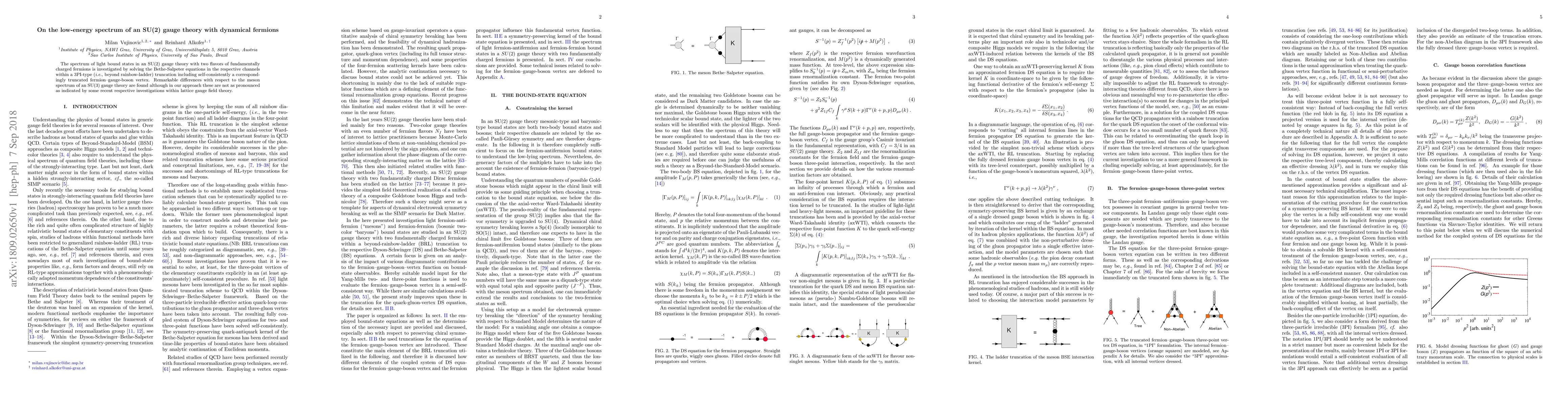 This paper investigates the low-energy spectrum of light bound states in an SU(2) gauge theory with two flavors of fermions by solving Bethe-Salpeter equations, revealing notable differences compared to the meson spectrum in an SU(3) gauge theory, though less pronounced than some recent lattice gauge field studies.
