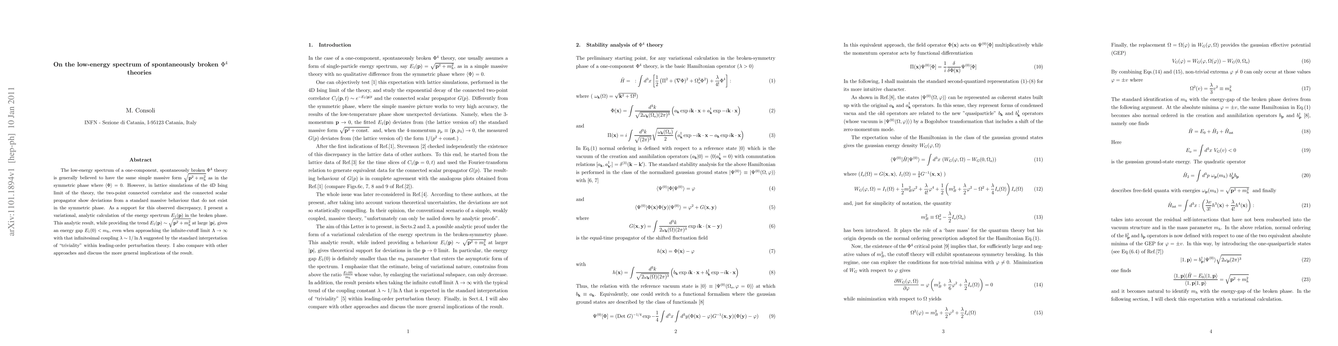 This paper investigates the low-energy spectrum of spontaneously broken \Phi^4 theories, finding deviations from the expected massive form in lattice simulations. An analytic calculation supports these deviations, revealing an energy gap at zero momentum, challenging the standard interpretation of triviality in perturbation theory.