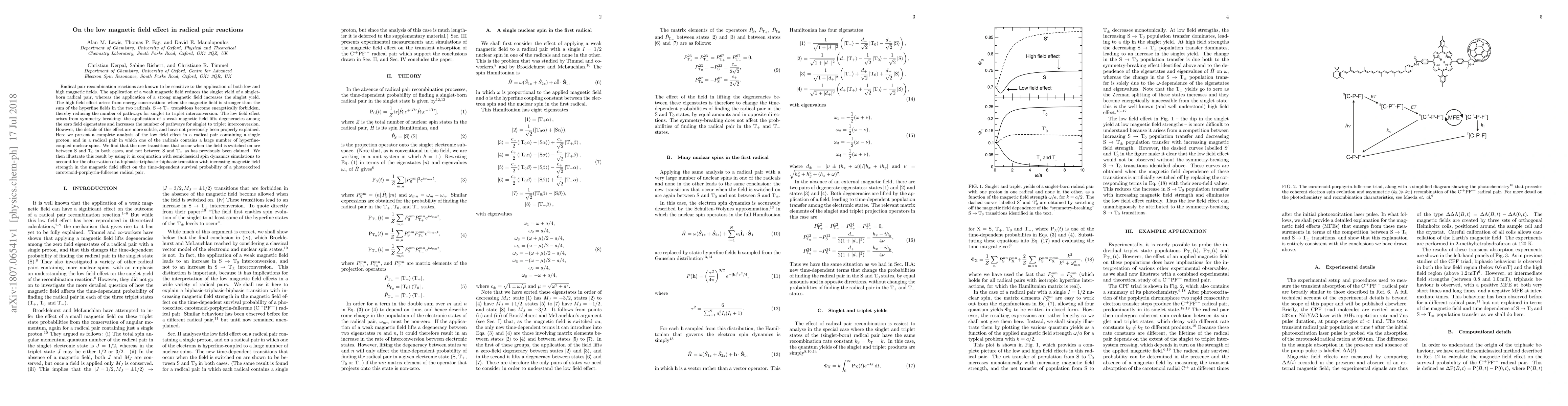 Radical pair recombination reactions are known to be sensitive to the application of both low and high magnetic fields. The application of a weak magnetic field reduces the singlet yield of a singlet-born radical pair, whereas the application of a strong magnetic field increases the singlet yield. The high field effect arises from energy conservation: when the magnetic field is stronger than the sum of the hyperfine fields in the two radicals, ${\rm S}\to {\rm T}_{\pm}$ transitions become energetically forbidden, thereby reducing the number of pathways for singlet to triplet interconversion. The low field effect arises from symmetry breaking: the application of a weak magnetic field lifts degeneracies among the zero field eigenstates and increases the number of pathways for singlet to triplet interconversion. However, the details of this effect are more subtle, and have not previously been properly explained. Here we present a complete analysis of the low field effect in a radical pair containing a single proton, and in a radical pair in which one of the radicals contains a large number of hyperfine-coupled nuclear spins. We find that the new transitions that occur when the field is switched on are between ${\rm S}$ and ${\rm T}_0$ in both cases, and not between ${\rm S}$ and ${\rm T}_{\pm}$ as has previously been claimed. We then illustrate this result by using it in conjunction with semiclassical spin dynamics simulations to account for the observation of a biphasic--triphasic--biphasic transition with increasing magnetic field strength in the magnetic field effect on the time-dependent survival probability of a photoexcited carotenoid-porphyrin-fullerene radical pair.
