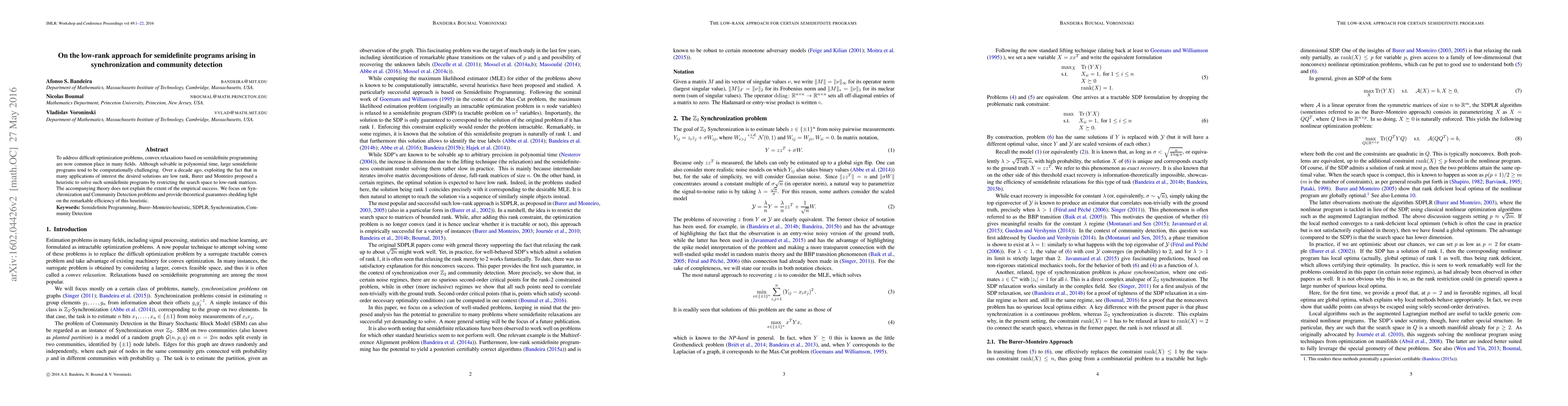 This paper investigates the low-rank approach for solving large semidefinite programs in synchronization and community detection, providing theoretical guarantees to explain the heuristic's empirical success and efficiency.