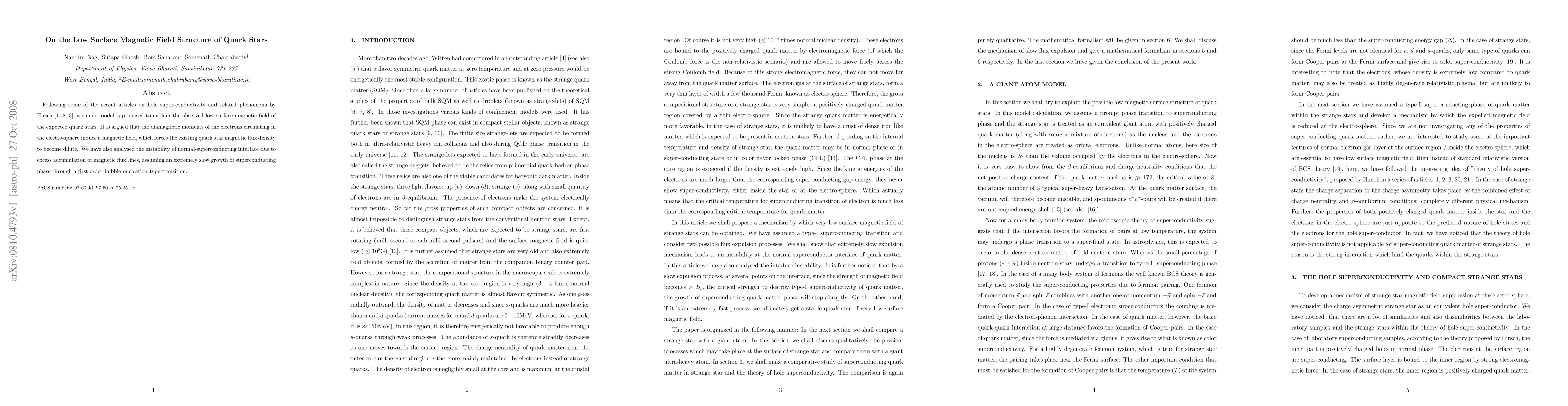 Following some of the recent articles on hole super-conductivity and related phenomena by Hirsch \cite{H1,H2,H3}, a simple model is proposed to explain the observed low surface magnetic field of the expected quark stars. It is argued that the diamagnetic moments of the electrons circulating in the electro-sphere induce a magnetic field, which forces the existing quark star magnetic flux density to become dilute. We have also analysed the instability of normal-superconducting interface due to excess accumulation of magnetic flux lines, assuming an extremely slow growth of superconducting phase through a first order bubble nucleation type transition.