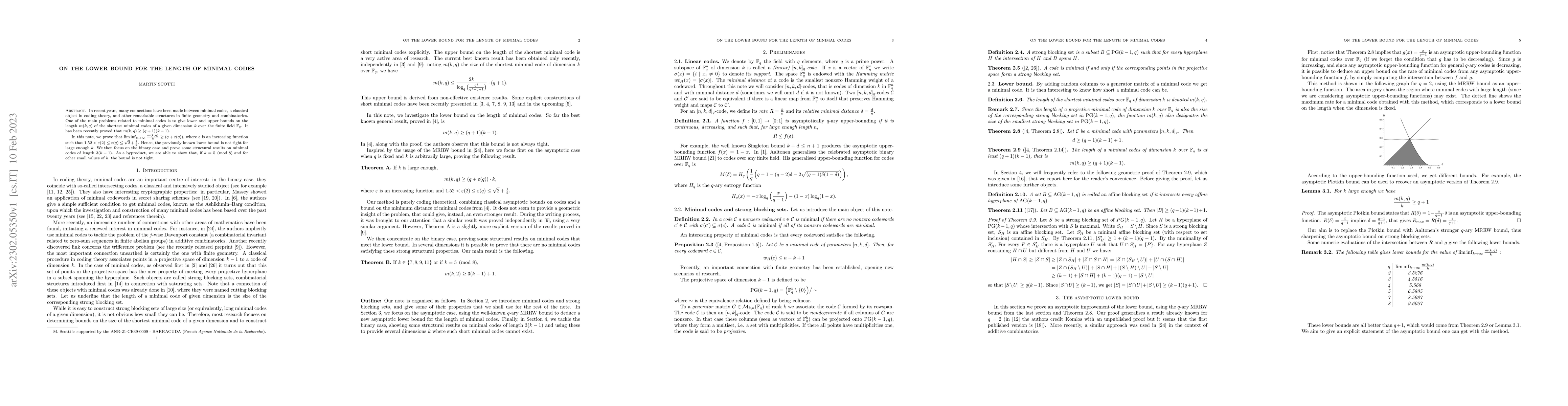 This paper establishes a new lower bound for the length of minimal codes, proving that $\liminf_{k \rightarrow \infty} \frac{m(k, q)}{k} \geq (q+ \varepsilon(q))$, where $\varepsilon(q)$ is an increasing function. It shows that the previously known lower bound is not tight for sufficiently large dimensions $k$.
