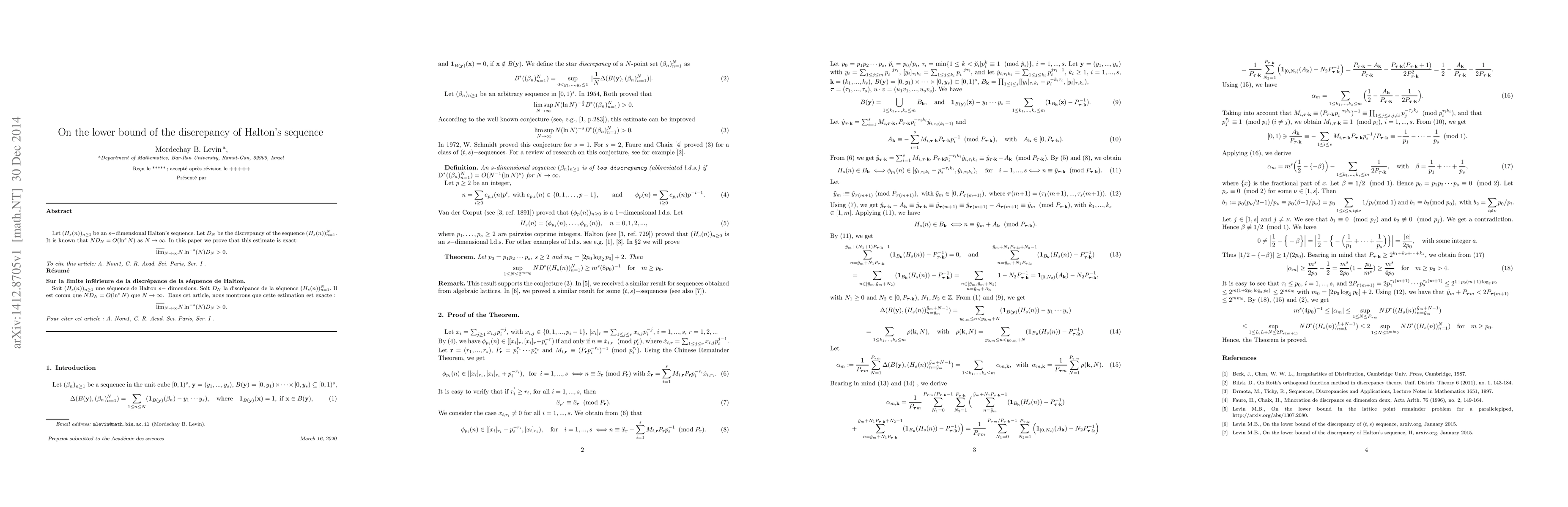 Let $ (H_s(n))_{n \geq 1} $ be an $s-$dimensional Halton's sequence. Let $D_N$ be the discrepancy of the sequence $ (H_s(n))_{n = 1}^{N} $. It is known that $ND_N =O(\ln^s N)$ as $N \to \infty $. In this paper we prove that this estimate is exact: $$ \overline{\lim}_{ N \to \infty} N \ln^{-s}(N) D_N >0. $$