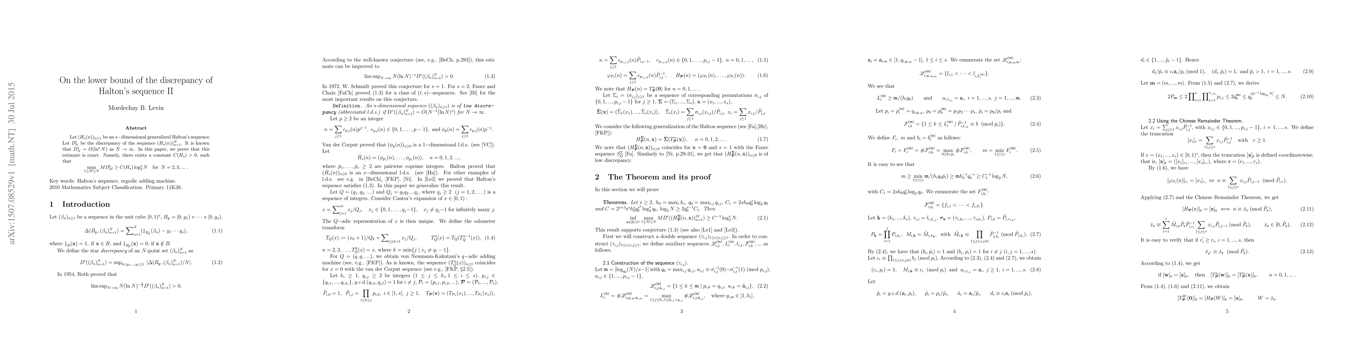 This paper establishes the exact lower bound of the discrepancy for generalized Halton's sequences, proving that $D^{*}_{N} = \Theta(\ln^s N)$ as $N \to \infty$. It shows that the discrepancy is at least $C(H_s) \log_2^s N$ for large $N$.