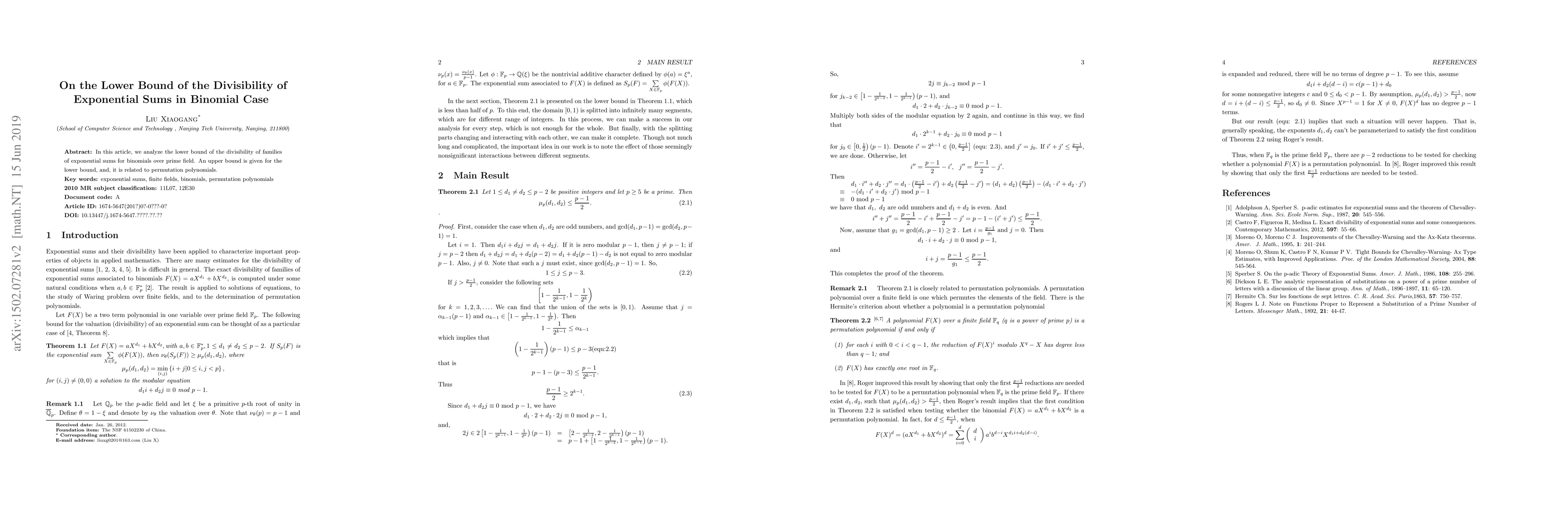 Francis Castro, et al [2] computed the exact divisibility of families of exponential sums associated to binomials $F(X) = aX^{d_1} + bX^{d_2}$ over $\mathbb{F}_p$, and a conjecture is presented for related work. Here we study this question.