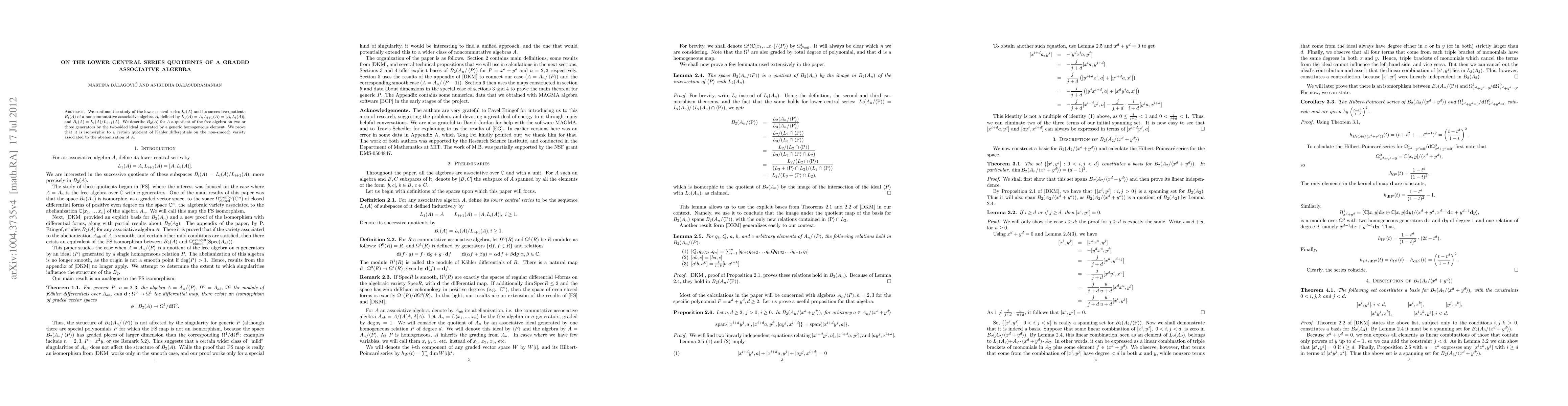 This paper investigates the lower central series quotients B_i(A) of a noncommutative associative algebra A, focusing on B_2(A) for A derived from a quotient of the free algebra on two or three generators. It demonstrates that B_2(A) is isomorphic to a specific quotient of Kaehler differentials linked to the non-smooth variety related to the abelianization of A.