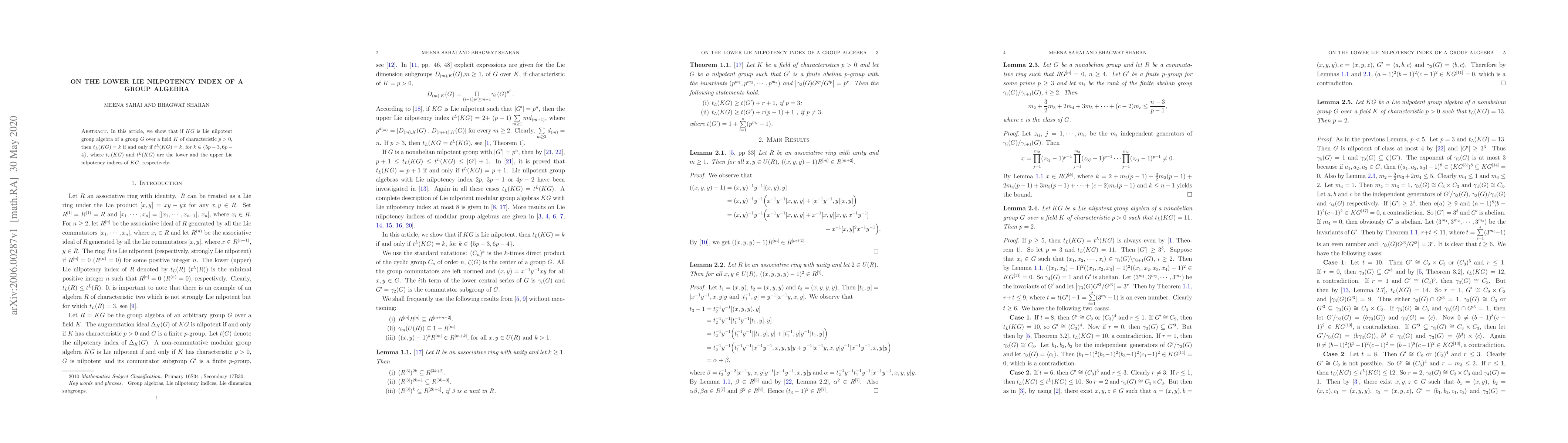 In this article, we show that if $KG$ is Lie nilpotent group algebra of a group $G$ over a field $K$ of characteristic $p>0$, then $t_{L}(KG)=k$ if and only if $t^{L}(KG)=k$, for $k\in\{5p-3, 6p-4\}$, where $t_{L}(KG)$ and $t^{L}(KG)$ are the lower and the upper Lie nilpotency indices of $KG$, respectively.