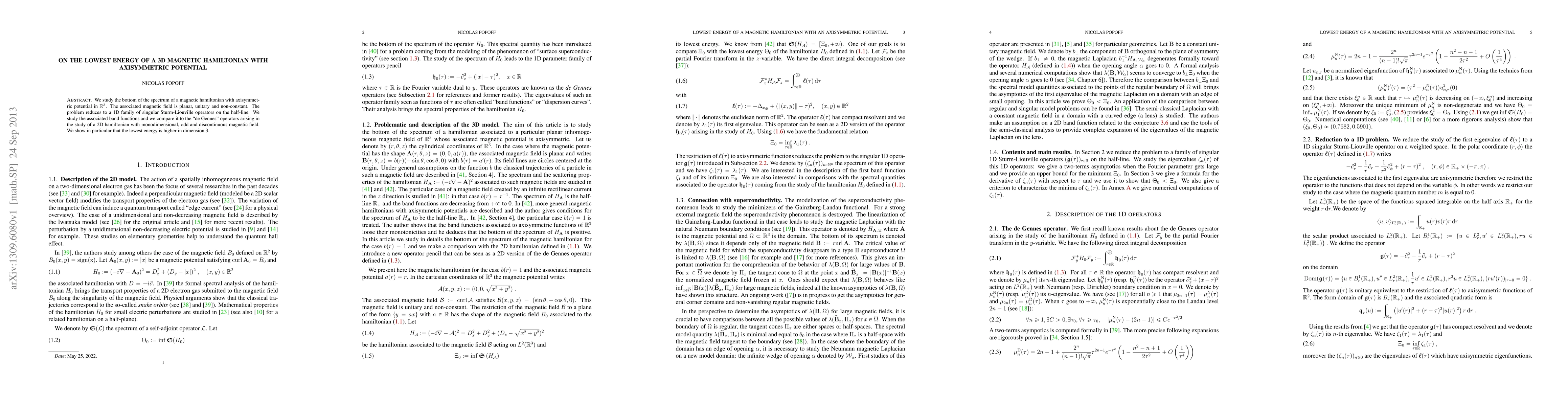 We study the bottom of the spectrum of a magnetic hamiltonian with axisymmetrical potential in R3. The associated magnetic field is planar, unitary and non-constant. The problem reduces to a 1D-family of singular Sturm-Liouville operators on the half-line. We study to associated band functions and we compare it to the "de Gennes" operators arising in the study of a 2D-hamiltonian with monodimensional, odd and discontinuous magnetic field. We show in particular that the lowest energy is higher in dimension 3.