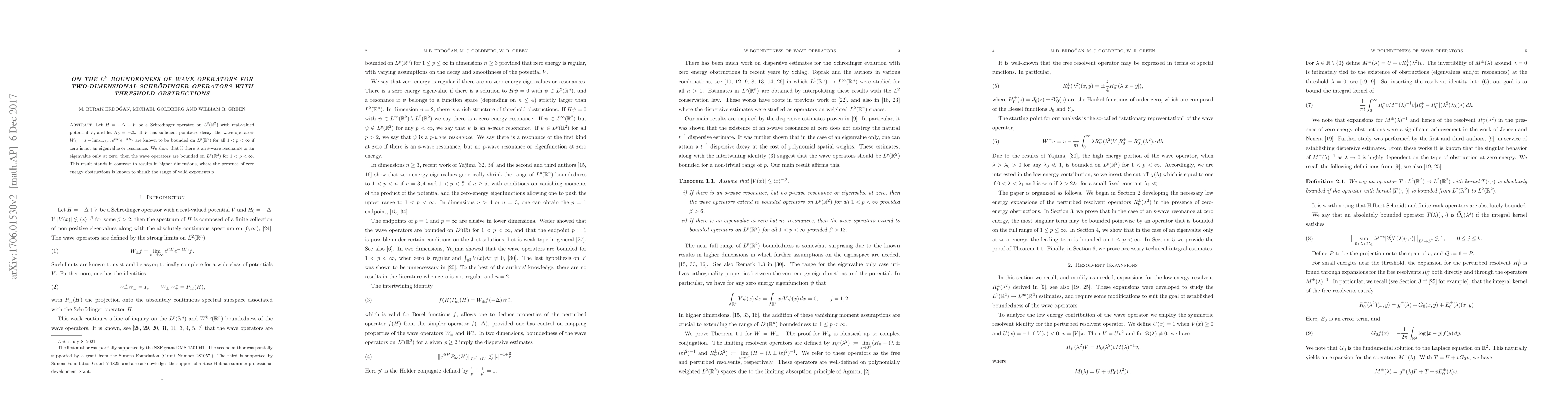 Let $H=-\Delta+V$ be a Schr\"odinger operator on $L^2(\mathbb R^2)$ with real-valued potential $V$, and let $H_0=-\Delta$. If $V$ has sufficient pointwise decay, the wave operators $W_{\pm}=s-\lim_{t\to \pm\infty} e^{itH}e^{-itH_0}$ are known to be bounded on $L^p(\mathbb R^2)$ for all $1< p< \infty$ if zero is not an eigenvalue or resonance. We show that if there is an s-wave resonance or an eigenvalue only at zero, then the wave operators are bounded on $L^p(\mathbb R^2)$ for $1 < p<\infty$. This result stands in contrast to results in higher dimensions, where the presence of zero energy obstructions is known to shrink the range of valid exponents $p$.
