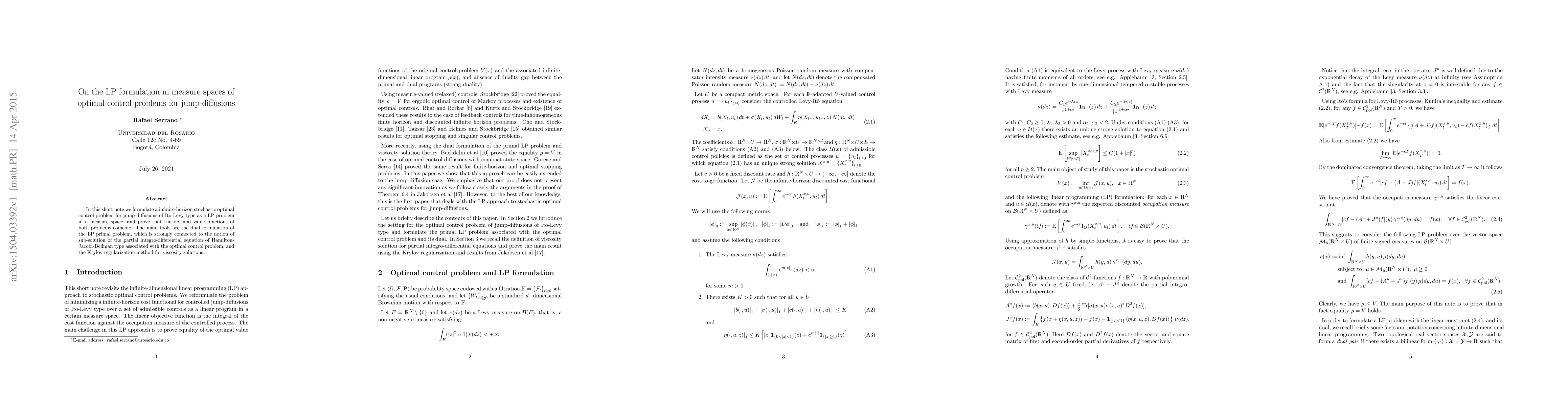 In this short note we formulate a infinite-horizon stochastic optimal control problem for jump-diffusions of Ito-Levy type as a LP problem in a measure space, and prove that the optimal value functions of both problems coincide. The main tools are the dual formulation of the LP primal problem, which is strongly connected to the notion of sub-solution of the partial integro-differential equation of Hamilton-Jacobi-Bellman type associated with the optimal control problem, and the Krylov regularization method for viscosity solutions.