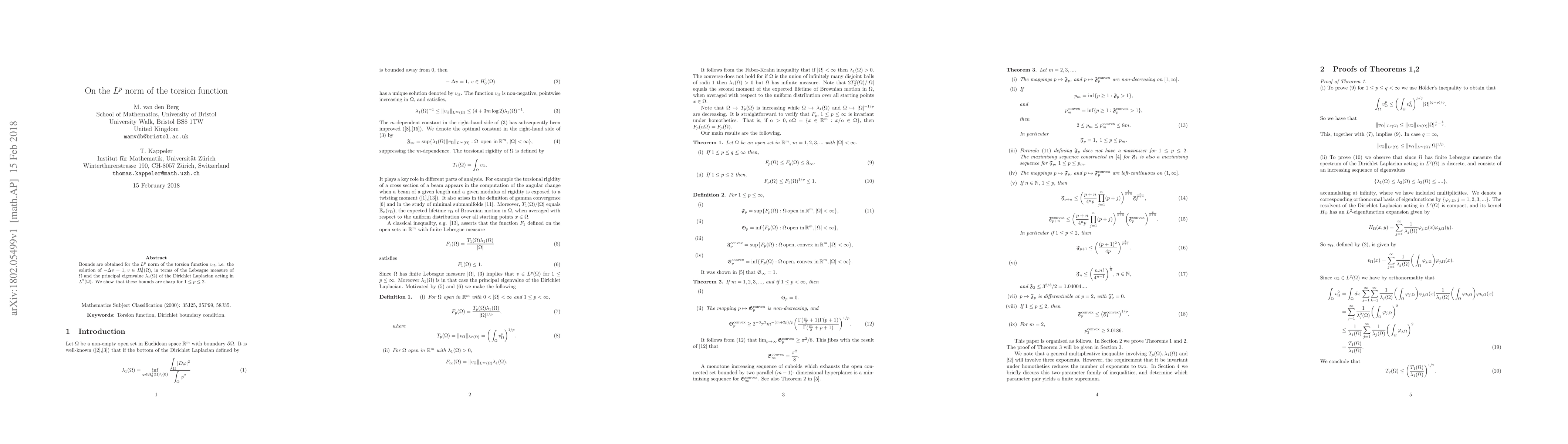 This research derives precise bounds for the $L^p$ norm of the torsion function, v_Ω, which solves the Poisson equation with unit source term in a domain Ω. The bounds are expressed in terms of Ω's measure and the principal eigenvalue of the Dirichlet Laplacian, λ₁(Ω). The study proves these bounds are optimal for 1≤p≤2.