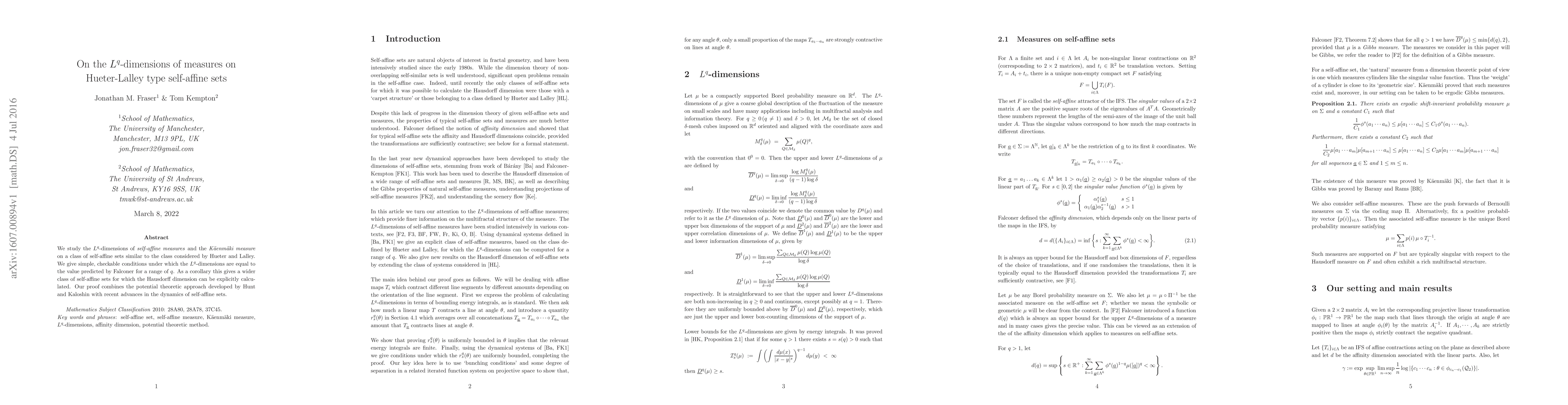 We study the L^q -dimensions of self-affine measures and the Kaenmaki measure on a class of self-affine sets similar to the class considered by Hueter and Lalley. We give simple, checkable conditions under which the Lq -dimensions are equal to the value predicted by Falconer for a range of q. As a corollary this gives a wider class of self-affine sets for which the Hausdorff dimension can be explicitly calculated. Our proof combines the potential theoretic approach developed by Hunt and Kaloshin with recent advances in the dynamics of self-affine sets.