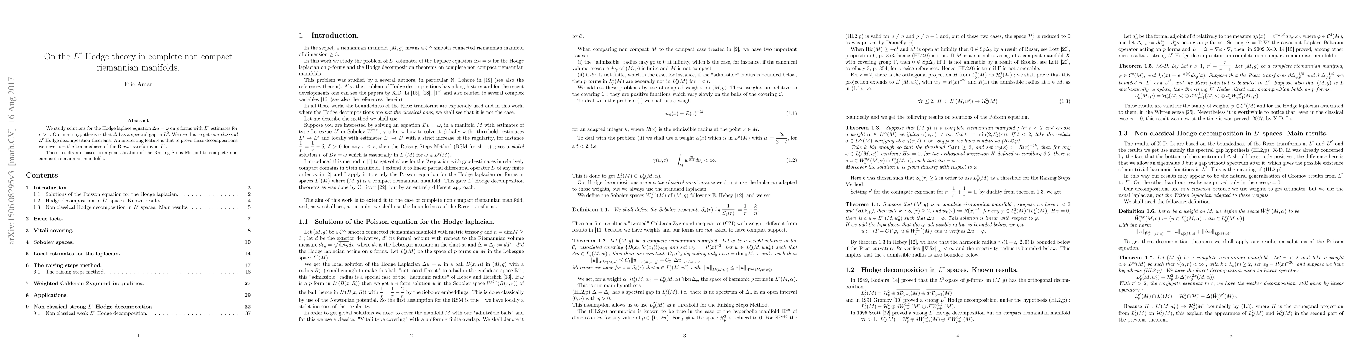 We study solutions for the Hodge laplace equation $\Delta u=\omega $ on $p$ forms with $\displaystyle L^{r}$ estimates for $\displaystyle r>1.$ Our main hypothesis is that $\Delta $ has a spectral gap in $\displaystyle L^{2}.$ We use this to get non classical $\displaystyle L^{r}$ Hodge decomposition theorems. An interesting feature is that to prove these decompositions we never use the boundedness of the Riesz transforms in $\displaystyle L^{s}.$ These results are based on a generalisation of the Raising Steps Method to complete non compact riemannian manifolds.