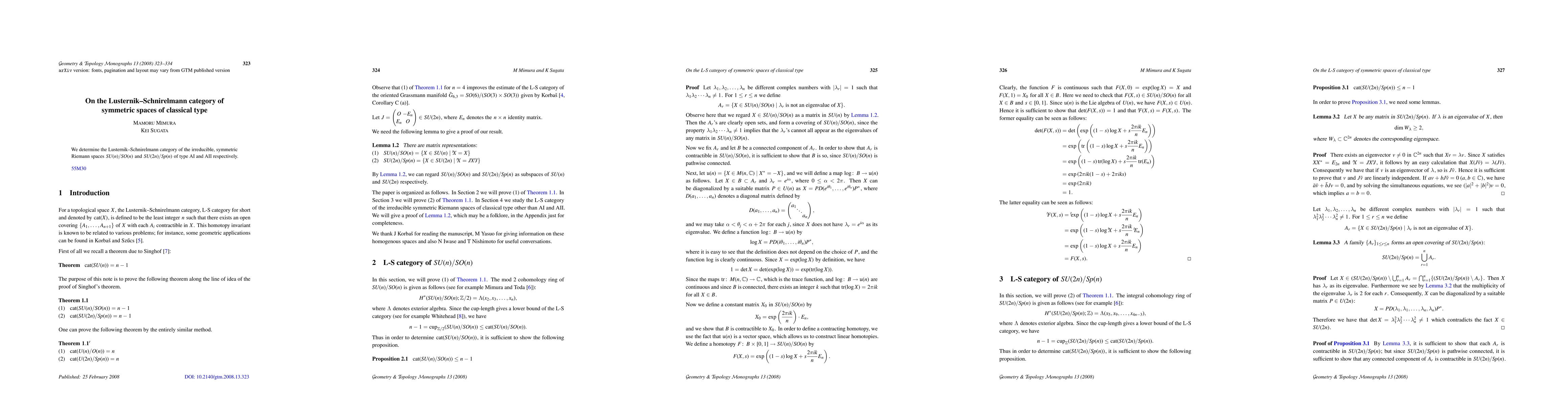 Summary: The paper calculates the Lusternik-Schnirelmann category for the irreducible symmetric spaces SU(n)/SO(n) and SU(2n)/Sp(n), which are of classical type AI and AII respectively. This category measures the complexity of topological spaces, providing insights into their structure.
