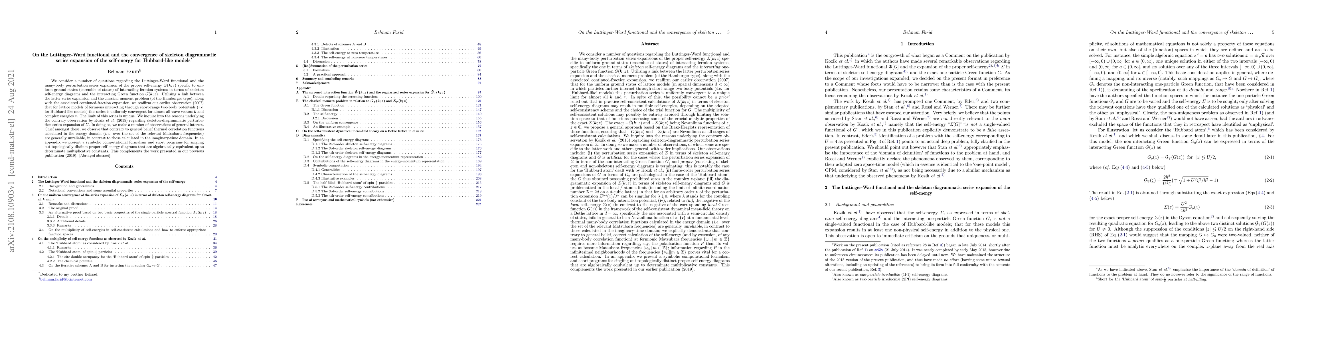 We consider a number of questions regarding the Luttinger-Ward functional and the many-body perturbation series expansion of the proper self-energy $\Sigma(\mathbf{k};z)$ specific to uniform ground states (ensemble of states) of interacting fermion systems in terms of skeleton self-energy diagrams and the interacting Green function $G(\mathbf{k};z)$. Utilising a link between the latter series expansion and the classical moment problem (of the Hamburger type), along with the associated continued-fraction expansion, we reaffirm our earlier observation (2007) that for lattice models of fermions interacting through short-range two-body potentials (i.e. for Hubbard-like models) this series is uniformly convergent for almost all wave vectors $\mathbf{k}$ and complex energies $z$. The limit of this series is unique. We inquire into the reasons underlying the contrary observation by Kozik et al. (2015) regarding skeleton-diagrammatic perturbation series expansion of $\Sigma$. In doing so, we make a number of observations of general interest. Chief amongst these, we observe that contrary to general belief thermal correlation functions calculated in the energy domain (i.e. over the set of the relevant Matsubara frequencies) are generally unreliable, in contrast to those calculated in the imaginary-time domain. In an appendix we present a symbolic computational formalism and short programs for singling out topologically distinct proper self-energy diagrams that are algebraically equivalent up to determinate multiplicative constants. This complements the work presented in our previous publication (2019). [Abridged abstract]