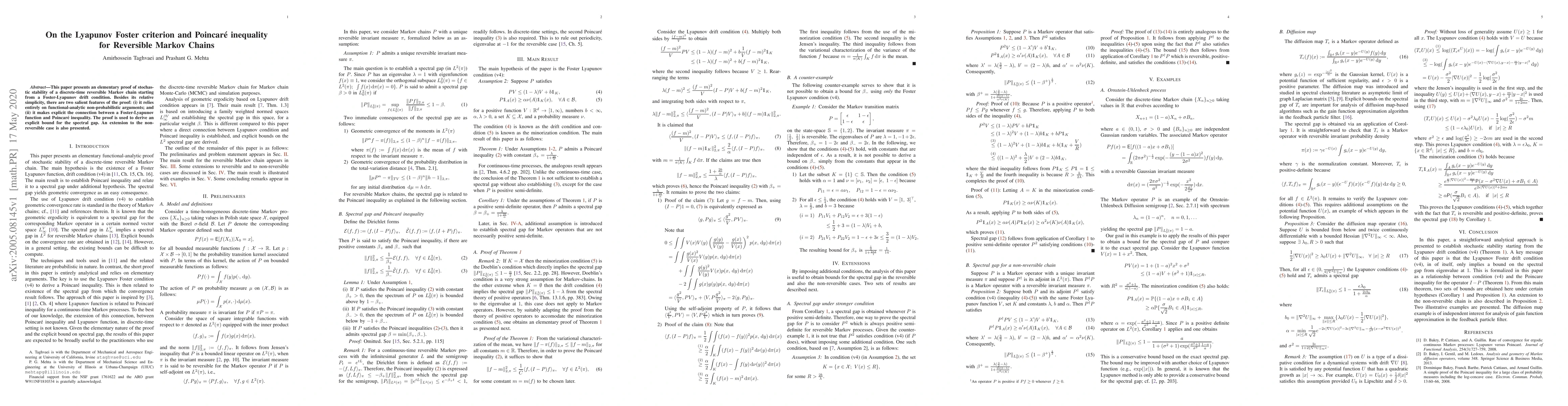 This paper provides an elementary proof of the stochastic stability of discrete-time reversible Markov chains using a Foster-Lyapunov drift condition, relying on functional-analytic arguments and highlighting the link between a Foster-Lyapunov function and the Poincaré inequality. The proof also yields an explicit spectral gap bound and extends to non-reversible cases.