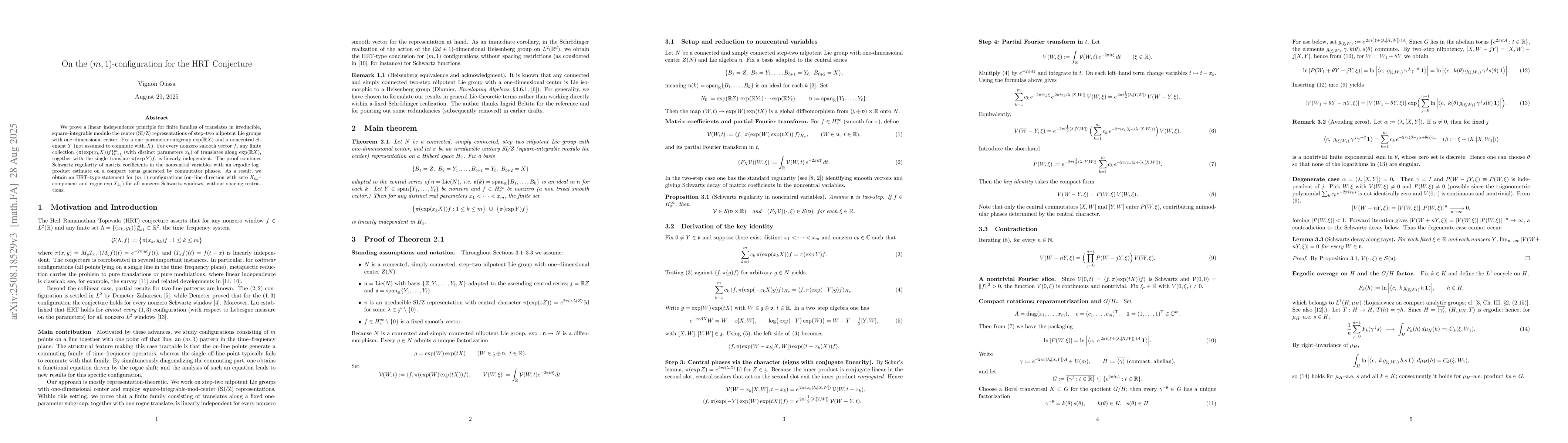 We prove a linear--independence principle for finite families of translates in irreducible, square--integrable modulo the center (SI/Z) representations of step--two nilpotent Lie groups with one--dimensional center. Fix a one--parameter subgroup $\exp(\mathbb R X)$ and a noncentral element $Y$ (not assumed to commute with $X$). For every nonzero smooth vector $f$, any finite collection $\{\pi(\exp(x_k X))f\}_{k=1}^m$ (with distinct parameters $x_k$) of translates along $\exp(\mathbb R X)$, together with the single translate $\pi(\exp Y)f$, is linearly independent. The proof combines Schwartz regularity of matrix coefficients in the noncentral variables with an ergodic log--product estimate on a compact torus generated by commutator phases. As a result, we obtain an HRT--type statement for $(m,1)$ configurations (on--line direction with zero $X_{k_0}$--component and rogue $\exp X_{k_0}$) for all nonzero Schwartz windows, without spacing restrictions.