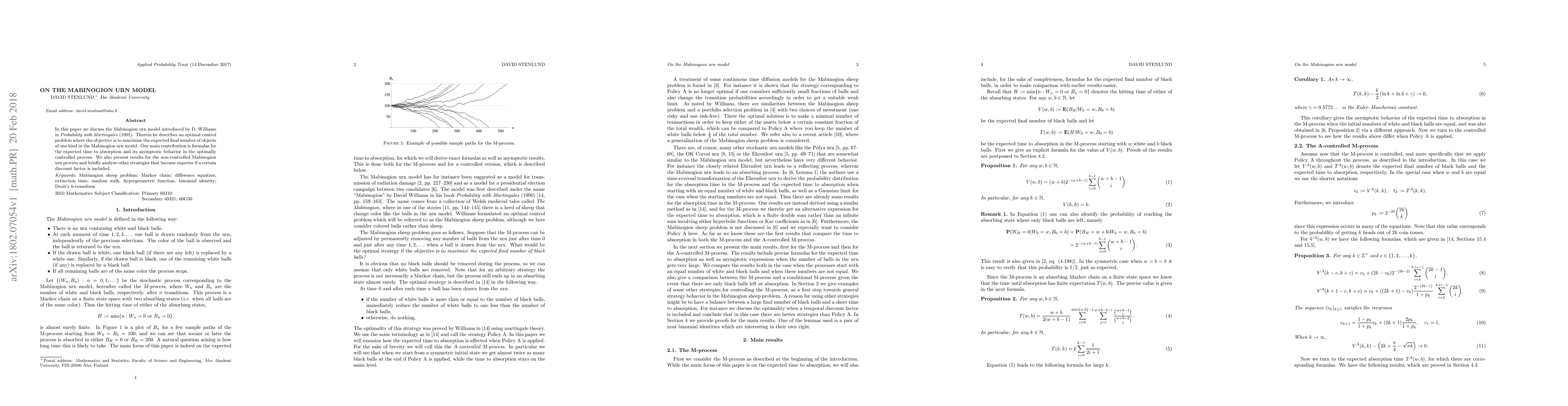 This paper explores the Mabinogion urn model, optimizing the expected final number of objects in an optimal control problem. It finds formulas for the expected time to absorption and its asymptotic behavior, as well as non-controlled process results and implications of including a discount factor.
