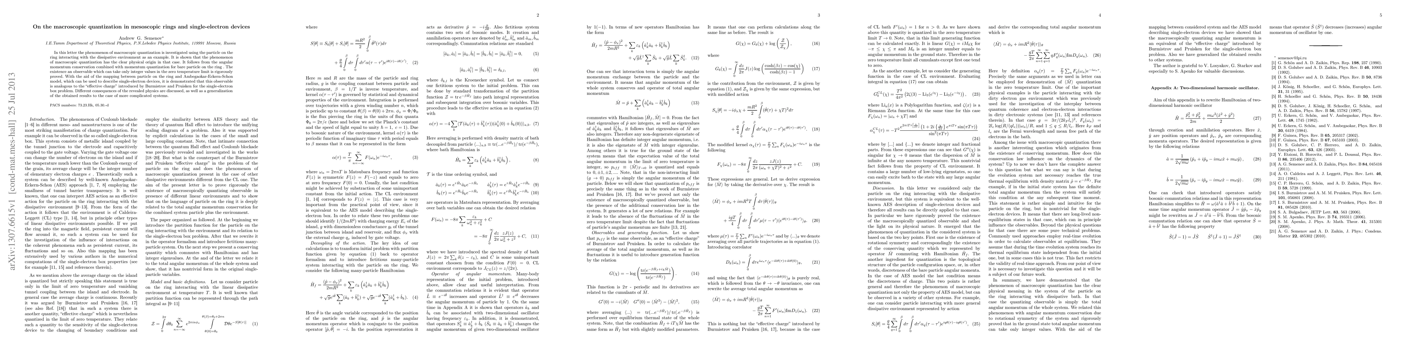 Researchers investigate macroscopic quantization in mesoscopic rings and single-electron devices, showing that it arises from angular momentum conservation and momentum quantization. They demonstrate a key observable that takes only integer values at zero temperature, analogous to the 'effective charge' in single-electron box problems.