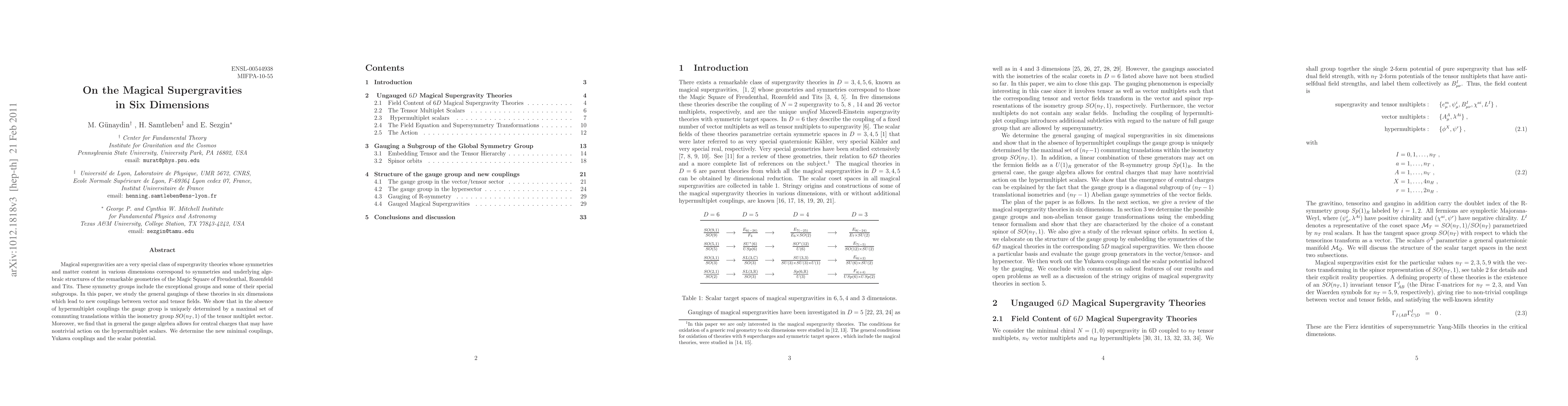 This paper explores magical supergravities in six dimensions, focusing on gaugings that reveal new couplings between vector and tensor fields. The gauge group is uniquely determined by a maximal set of commuting translations within the tensor multiplet sector's isometry group, and the gauge algebra includes central charges affecting hypermultiplet scalars, with detailed determination of minimal and Yukawa couplings and the scalar potential.