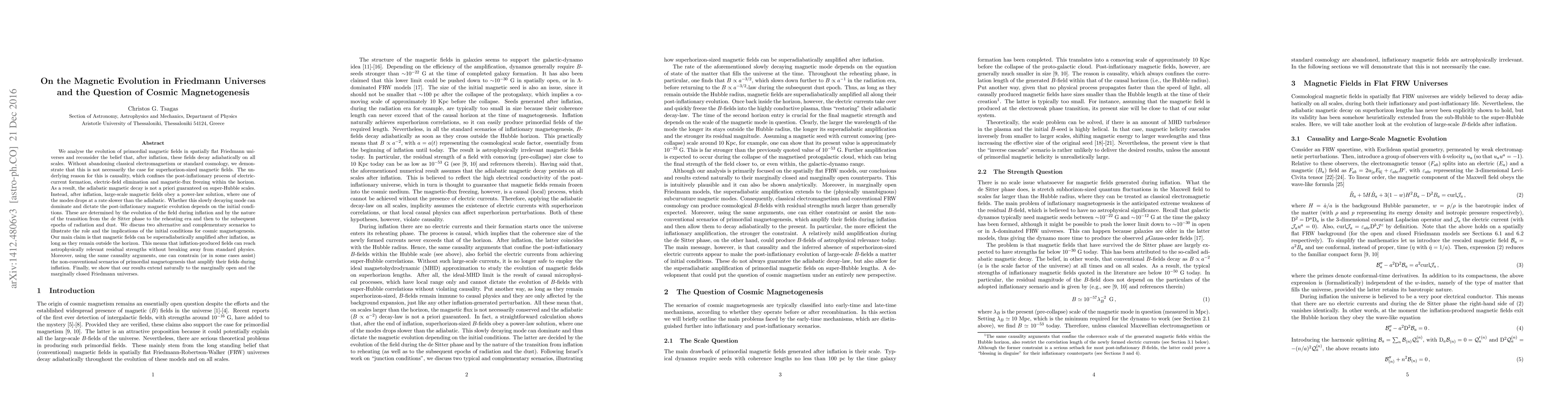 This paper explores the evolution of primordial magnetic fields in flat Friedmann universes, challenging the notion of their adiabatic decay post-inflation. It demonstrates that superhorizon-sized fields can experience non-adiabatic evolution due to horizon constraints, potentially leading to power-law decay and significant residual magnetic strengths without violating standard physics.